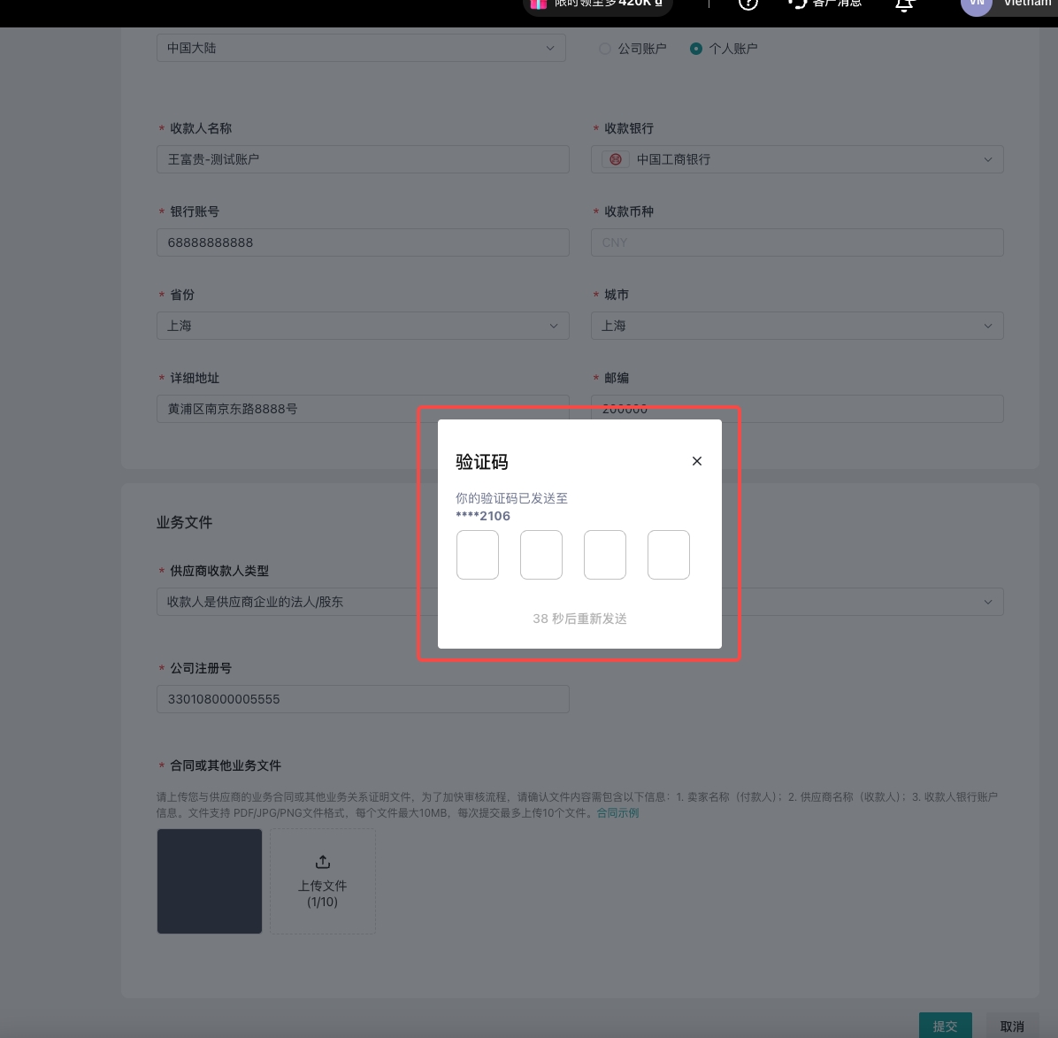 根据页面提示填写收款人的其他信息、上传业务文件材料。填写完成且确认无误后,点击【提交】。
