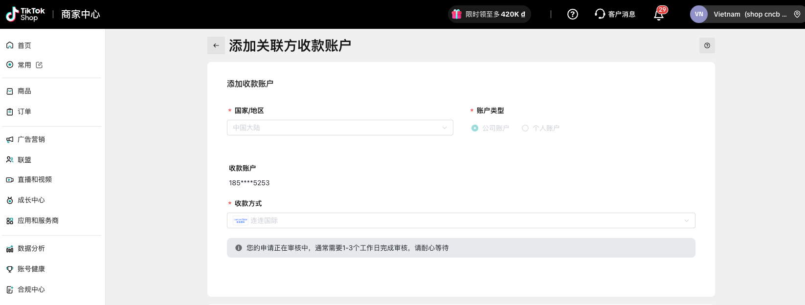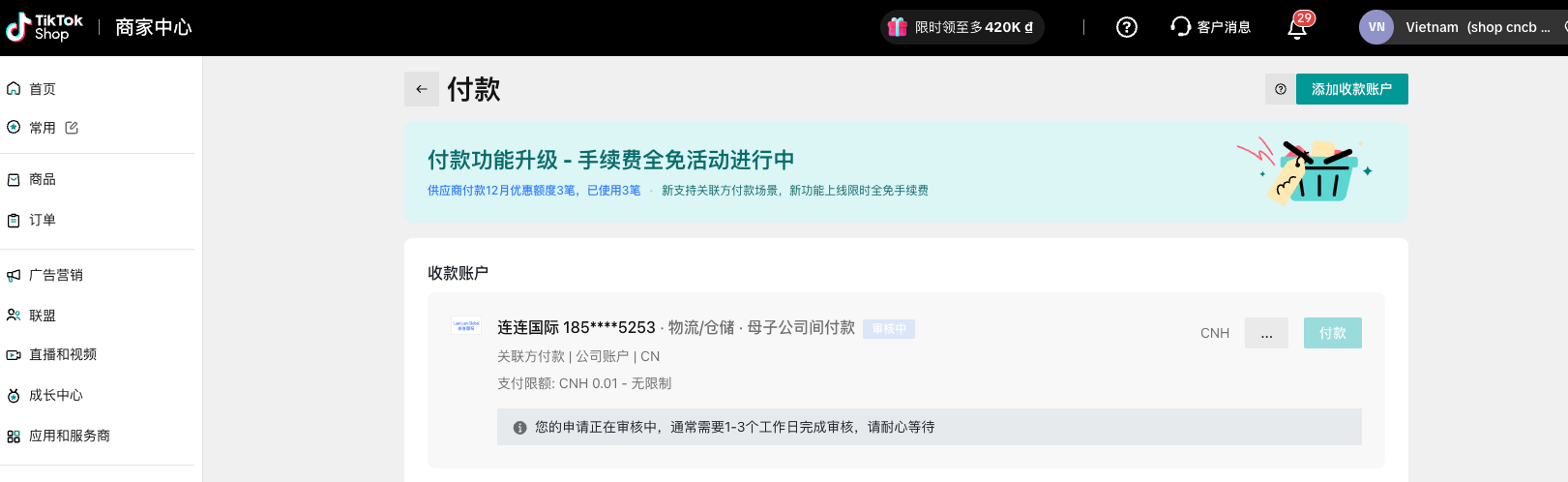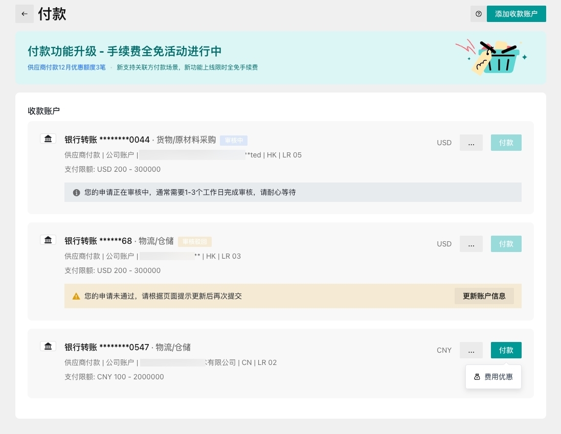 验证成功后,将返回到付款页面,并看到您刚才添加的收款账户进入审核中的状态。正常情况下1-3个工作日将收到审核结果,您可以随时进入付款功能查看结果。