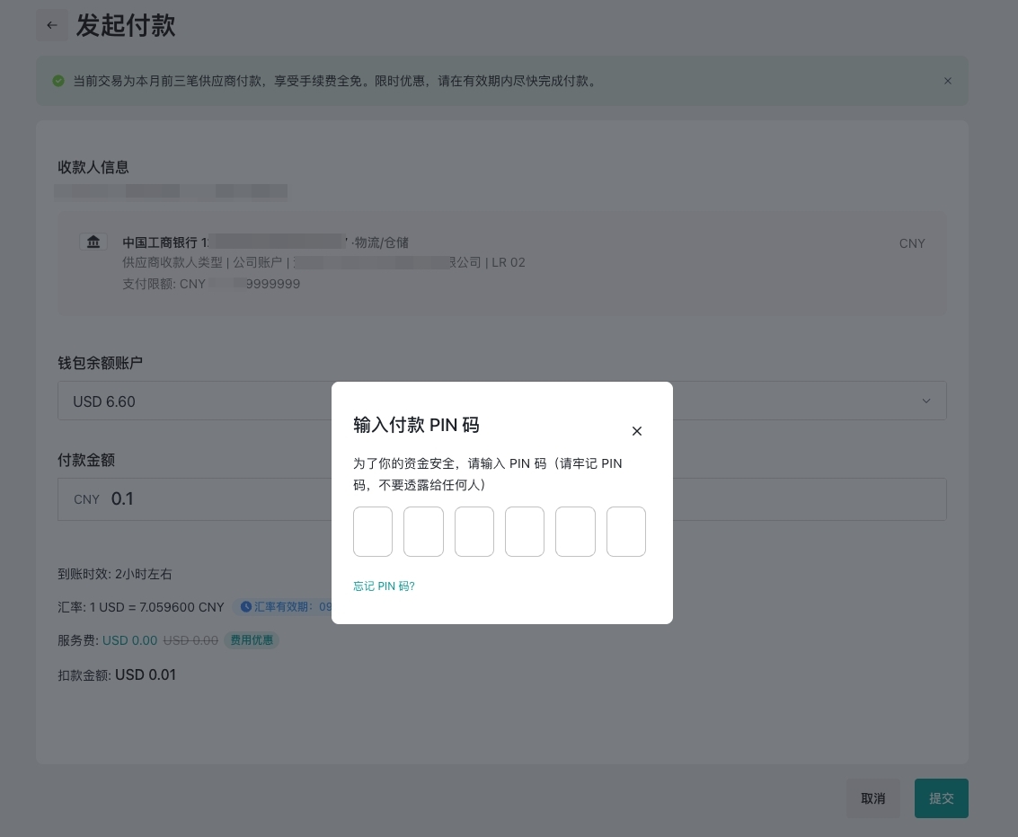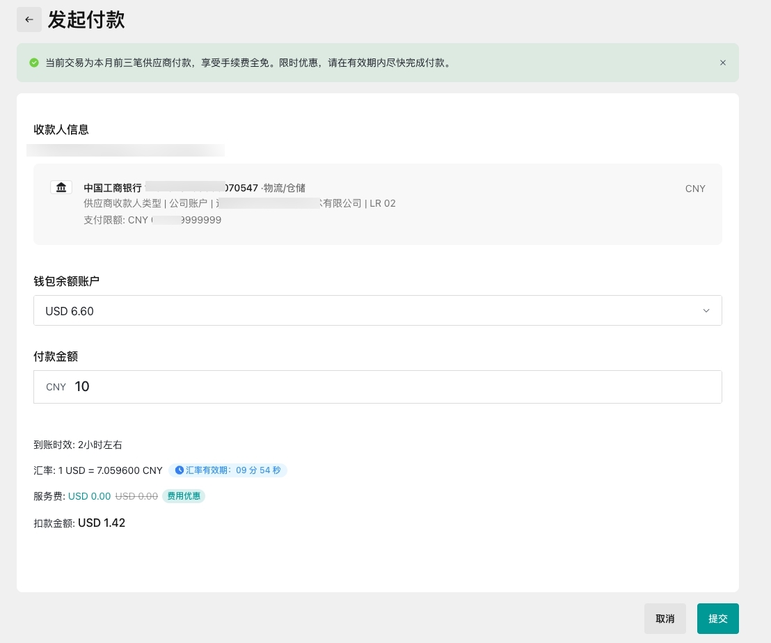 在付款页面选择您的余额账户作为扣款账户,并输入收款金额,输入完成后,页面会展示到账时效、费用、汇率信息、金额等信息。确认信息无误后,点击【提交】。