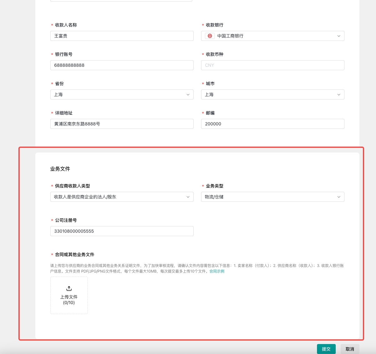 页面下半部分,请选择您供应商收款人的对应类型和业务类型,并根据页面提示填写收款人的其他信息,并上传业务文件材料。填写完成且确认无误后,点击【提交】。