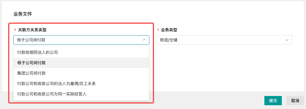 在添加收款账户页面的下半部分,请选择您跟关联方收款人的关系类型和业务类型。关联方关系类型目前支持5种,每种类型需要补充填写的信息和上传的材料文件不同,请根据实际情况进行选择。