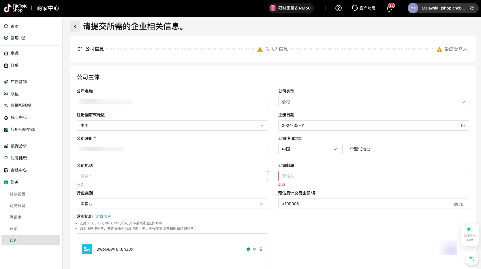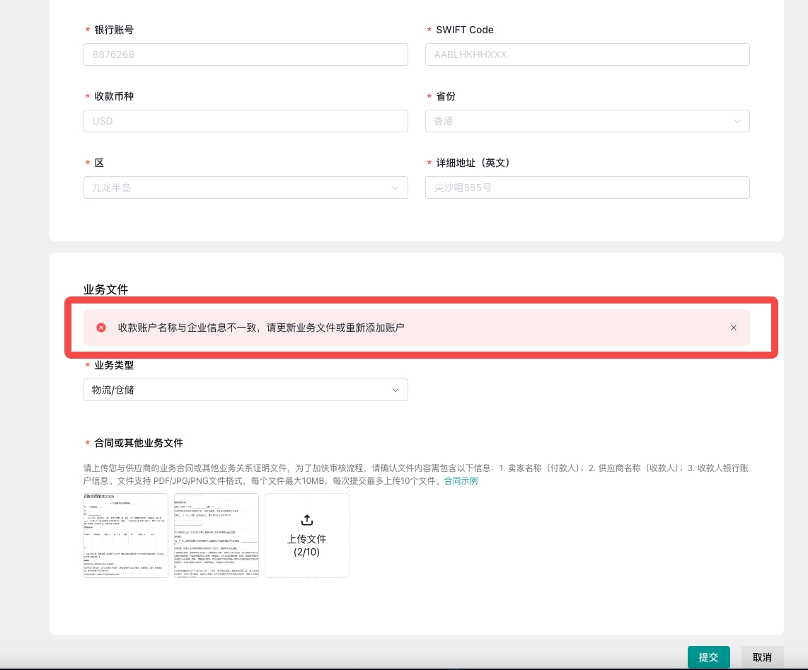注意:您填写的收款账户信息,需要与您业务文件中的收款方一致,并确认文件有效签章,否则将影响您的后续审核流程。