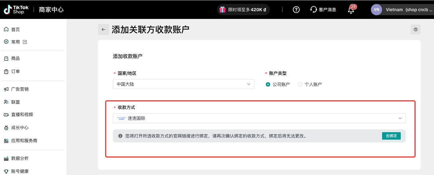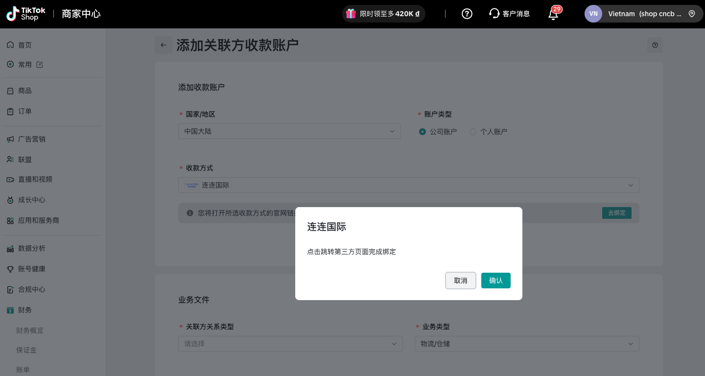 如果收款方式选择连连国际、派安盈、万里汇,需要跳转到所选收款方式的官网进行登录和绑定,请根据页面提示进行操作。