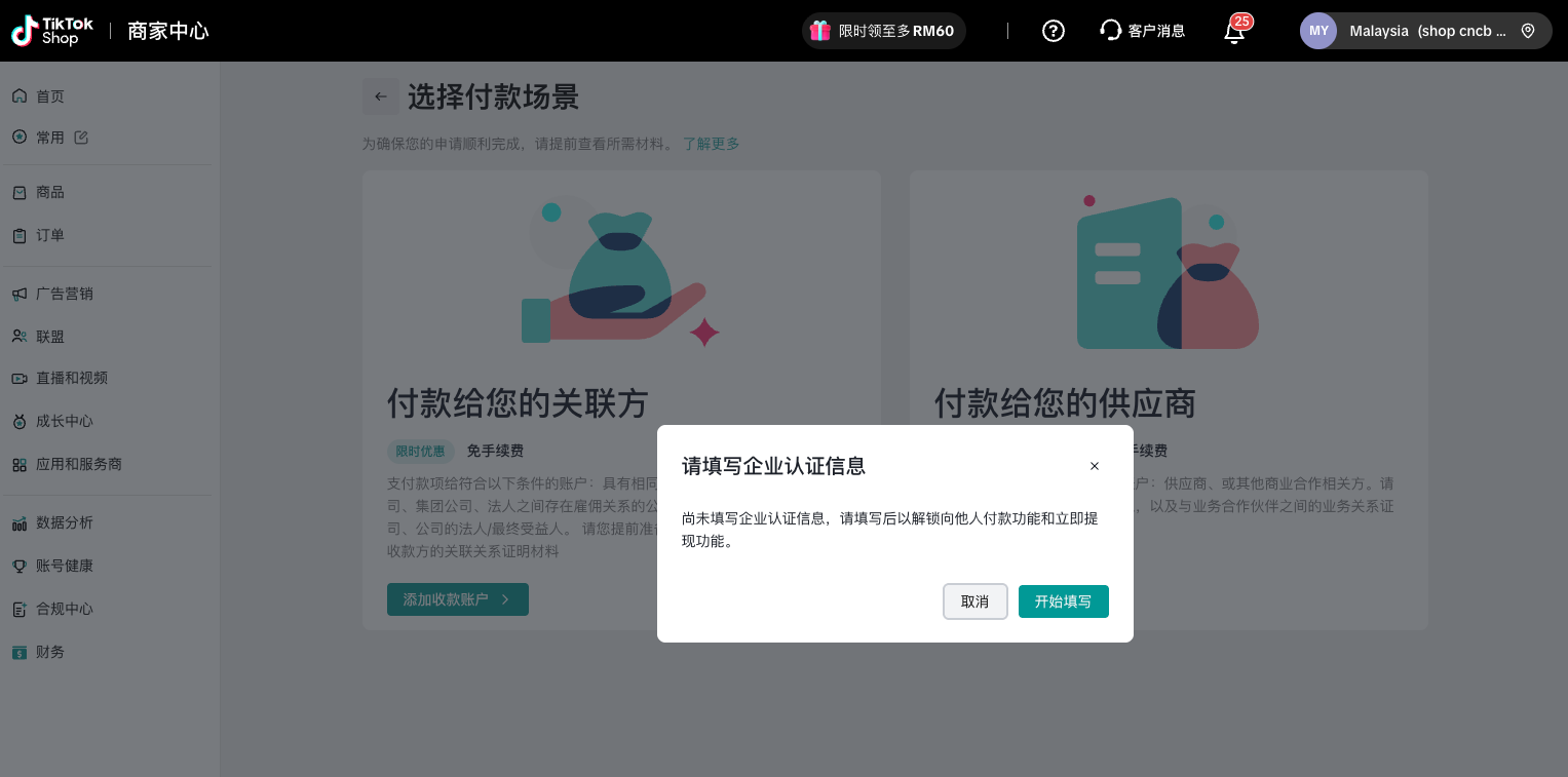 若您当前还未完成企业认证(补充企业受益人信息且平台审核通过),点击【添加收款账户】按钮后将引导您到企业信息补充页面。