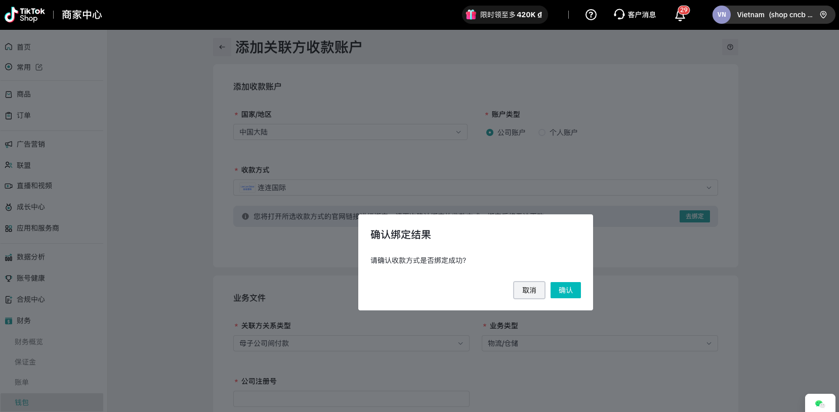 绑定完成后,回到添加收款账户页面,点击弹窗按钮确认绑定结果。