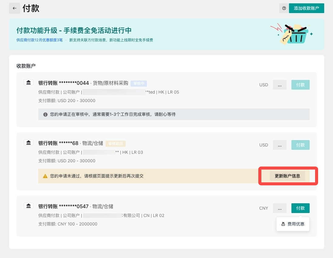 点击弹窗【知道了】按钮,将返回到付款页面,并看到您刚才添加的收款账户进入审核中状态,您可以随时进入付款功能查看审核结果。