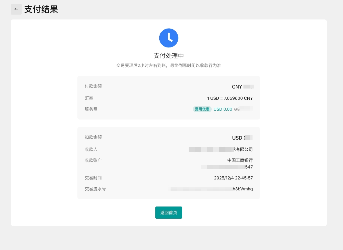 返回首页后,您可以随时在交易历史中查看当前付款的状态和交易信息。