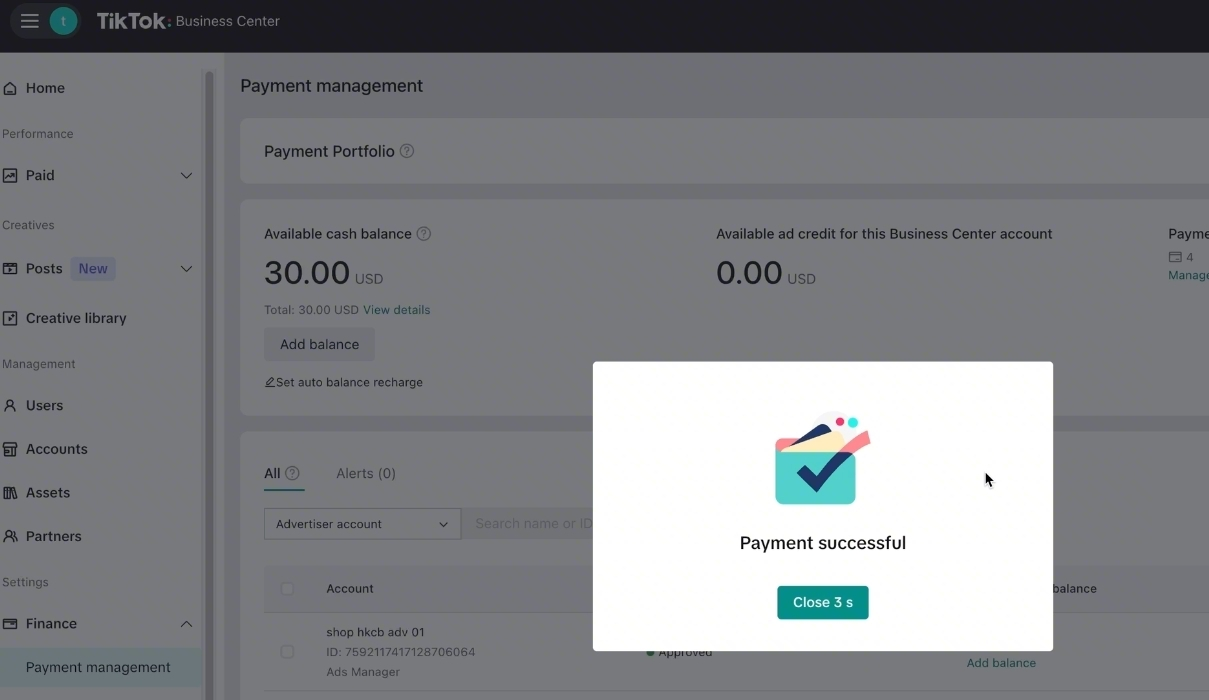 已经开通商家钱包的商户,可以直接使用钱包余额支付的TikTok广告金,省去添加银行卡等繁琐流程,结算款入账钱包后马上可用,灵活管理资金。