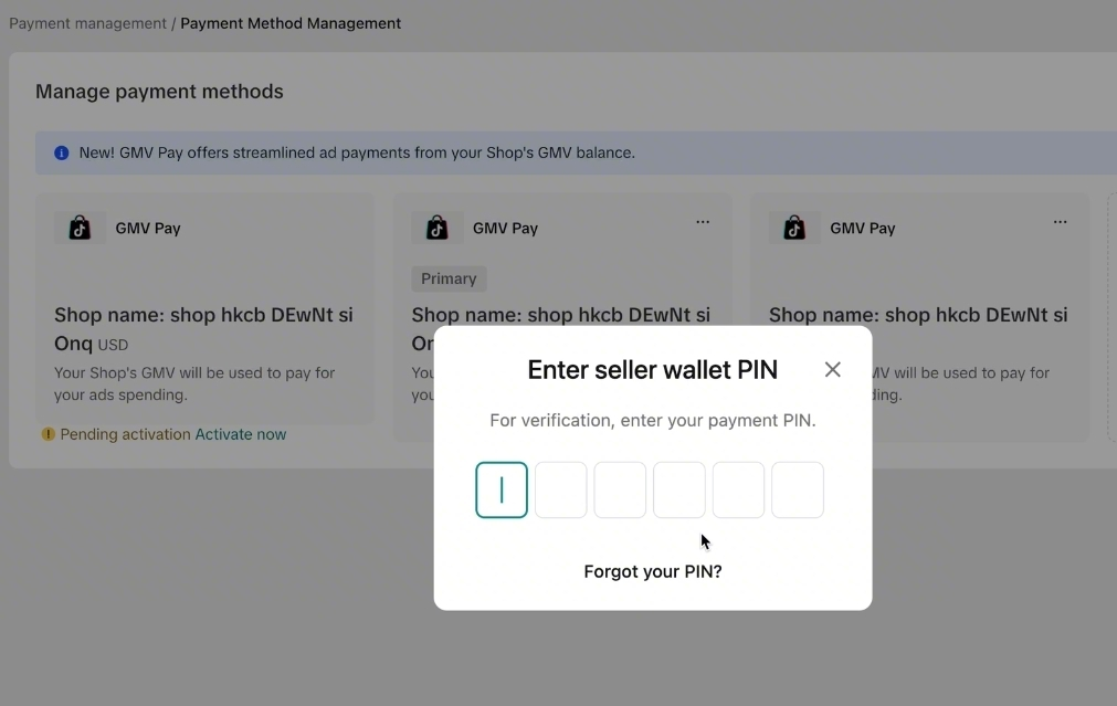 - 点击提交后,按照页面提示输入OTP验证码,启用钱包余额并验证商家钱包PIN码