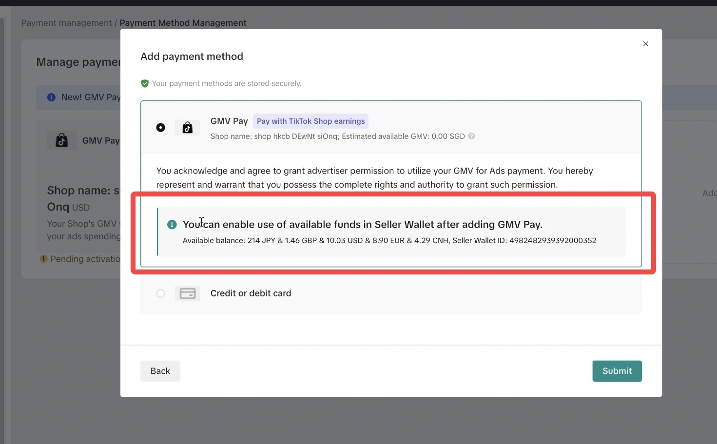- 添加成功后,可以看到支付方式中新增商家钱包选项
