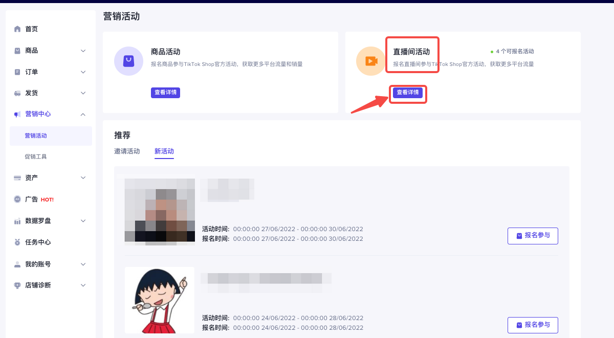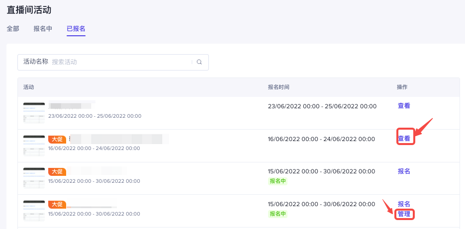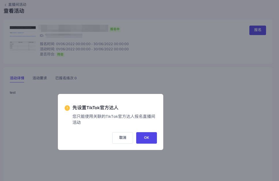 注册界面展示商家/达人已经报名的直播间活动,若商家的官方账号在达人后台进行了报名,则报名记录也会展示在这里