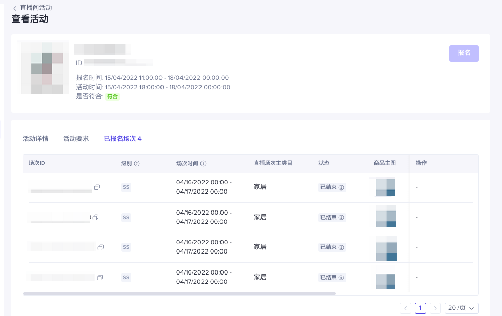 展示该活动下店铺在商家后台中所有报名场次+关联官方账号在达人后台报名的场次报名记录