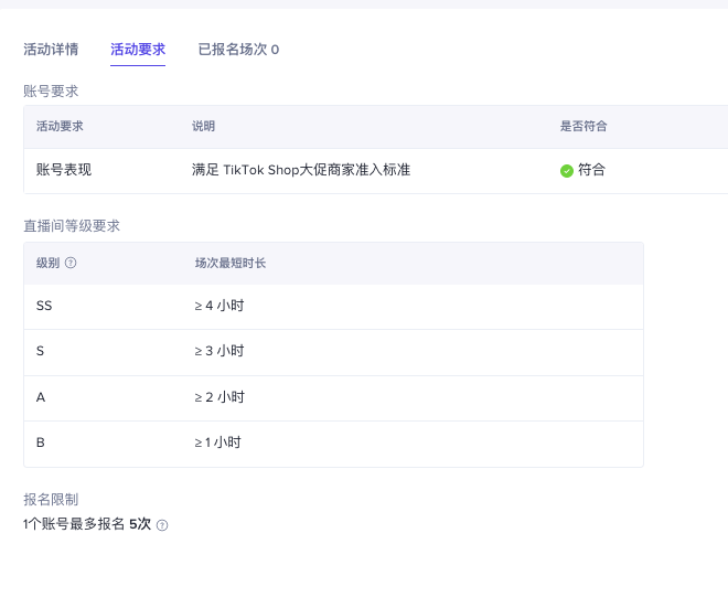 活动要求:展示不同级别直播间需要满足的最小直播时长