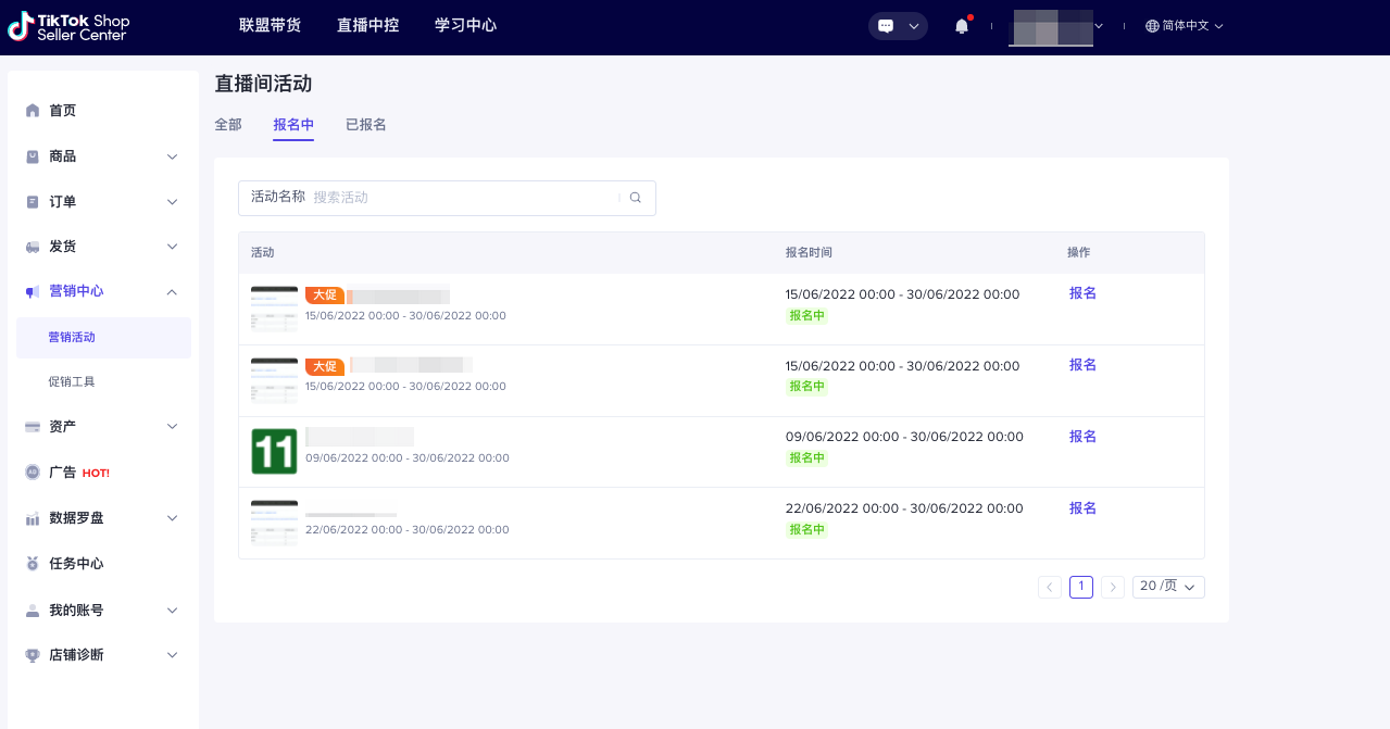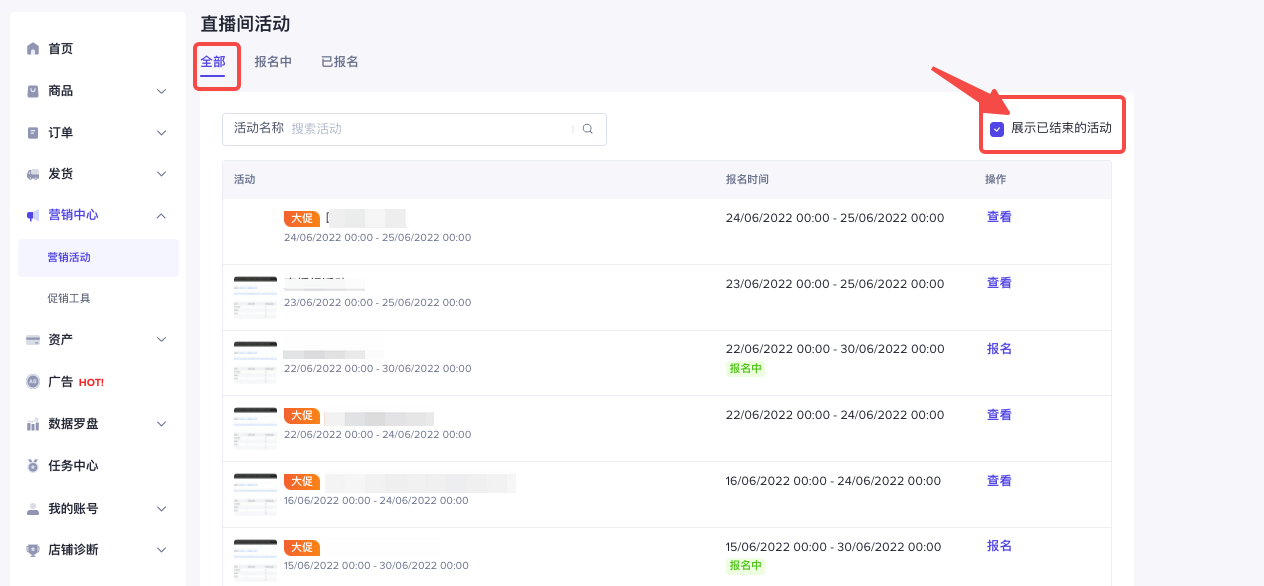 PC端:卖家中心-营销工具-活动-直播间活动