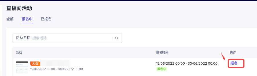 开放注册 界面展示可报名的直播间活动