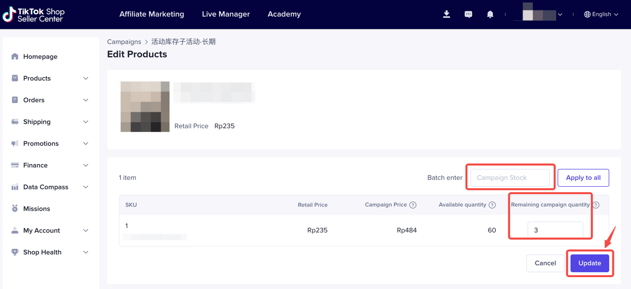 可在每个sku对应的Remaining campaign quantity中增加活动库存,请填写添加后的活动库存总值,而非增加值,也可在上方的批量编辑框中输入所有sku的活动库存,点击“Apply to all”则应用至所有sku。编辑完后点击“Update”则提交此次编辑的所有活动库存,通过平台审核后则会在活动期间生效。