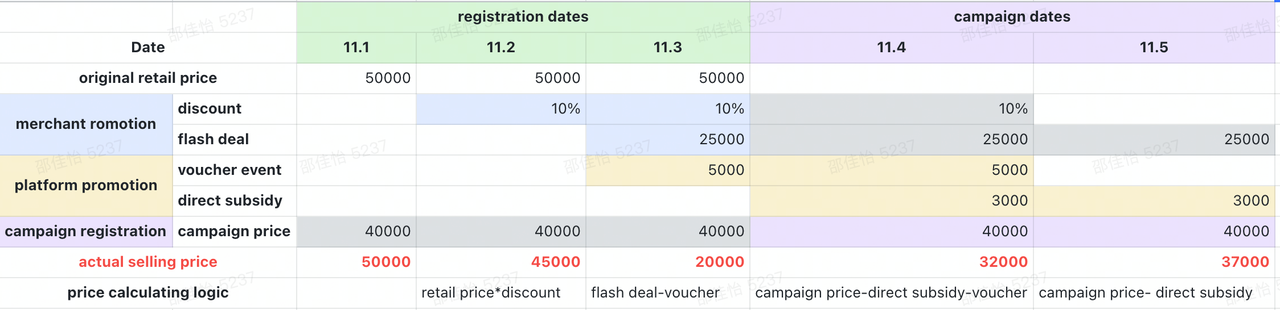 商品在campaign活动中且处在活动生效期间(campaign dates)或处在组货直播场次时段内,活动价可以和平台补贴叠加,因此可以叠加direct subsidy,补贴价格=活动价(campaign price) – 补贴金额(subsidy amount);也可以叠加平台券和包邮
