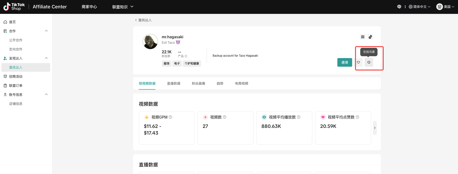 - 入口 2: 查找达人页面直接点击在线沟通.