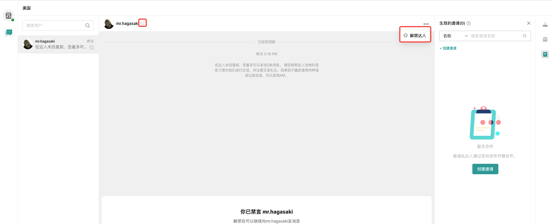 - 达人被屏蔽后,卖家也可以取消屏蔽创作者,如下所示。被禁言的达人将在其姓名旁边显示被阻止的图标