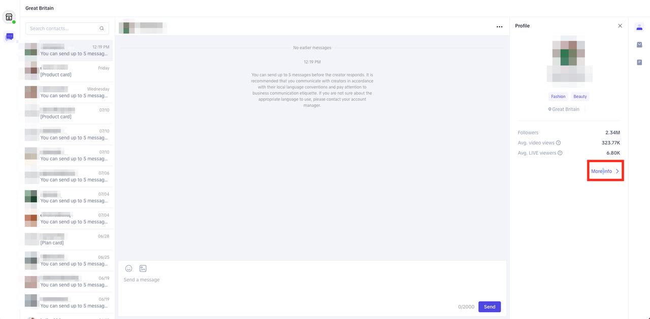 - 进入消息页面后,您将在左侧看到对话列表,右侧看到创建者的详细信息。要查看有关创建者的更多详细信息,请单击“更多信息”。