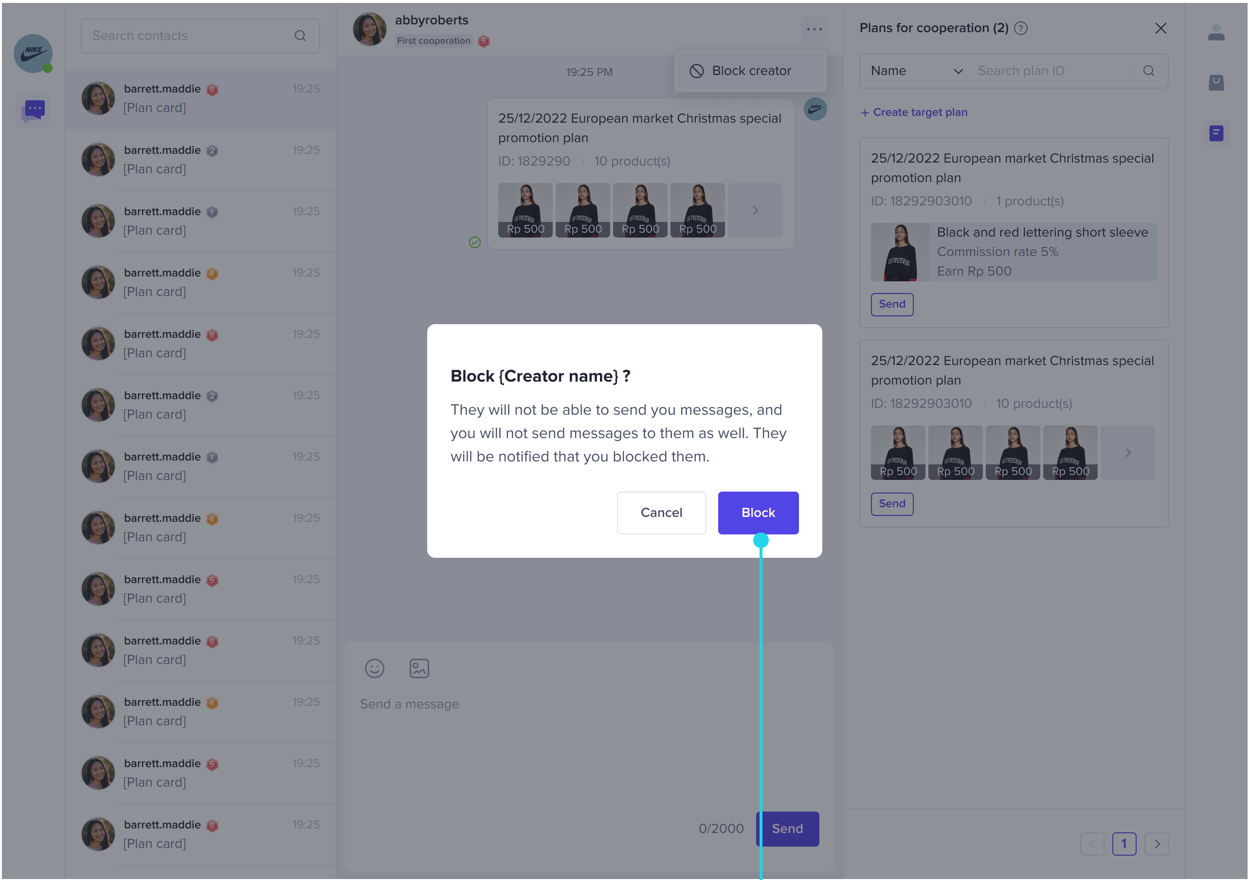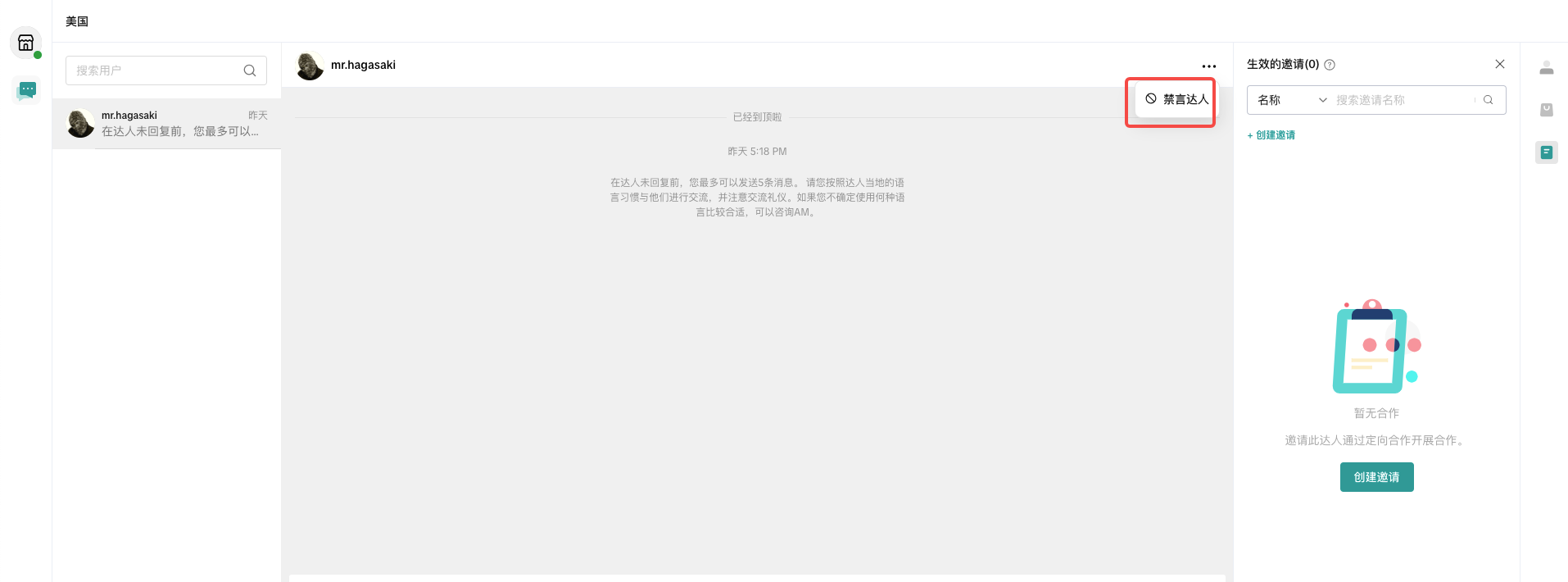 - 一旦卖家屏蔽了达人,达人将无法再向卖家发送消息。达人将在 IM 会话中收到被屏蔽的提示:“您现在无法向卖家发送消息,因为您已被他们屏蔽。