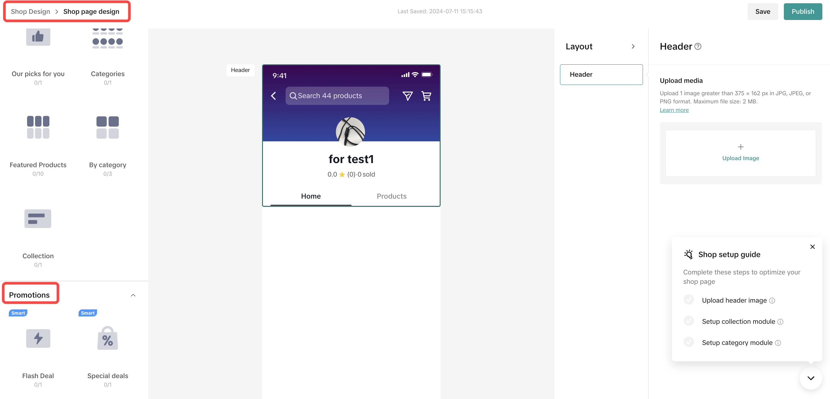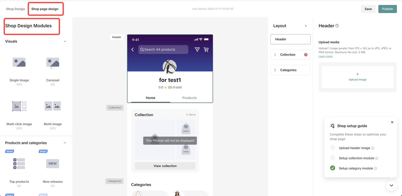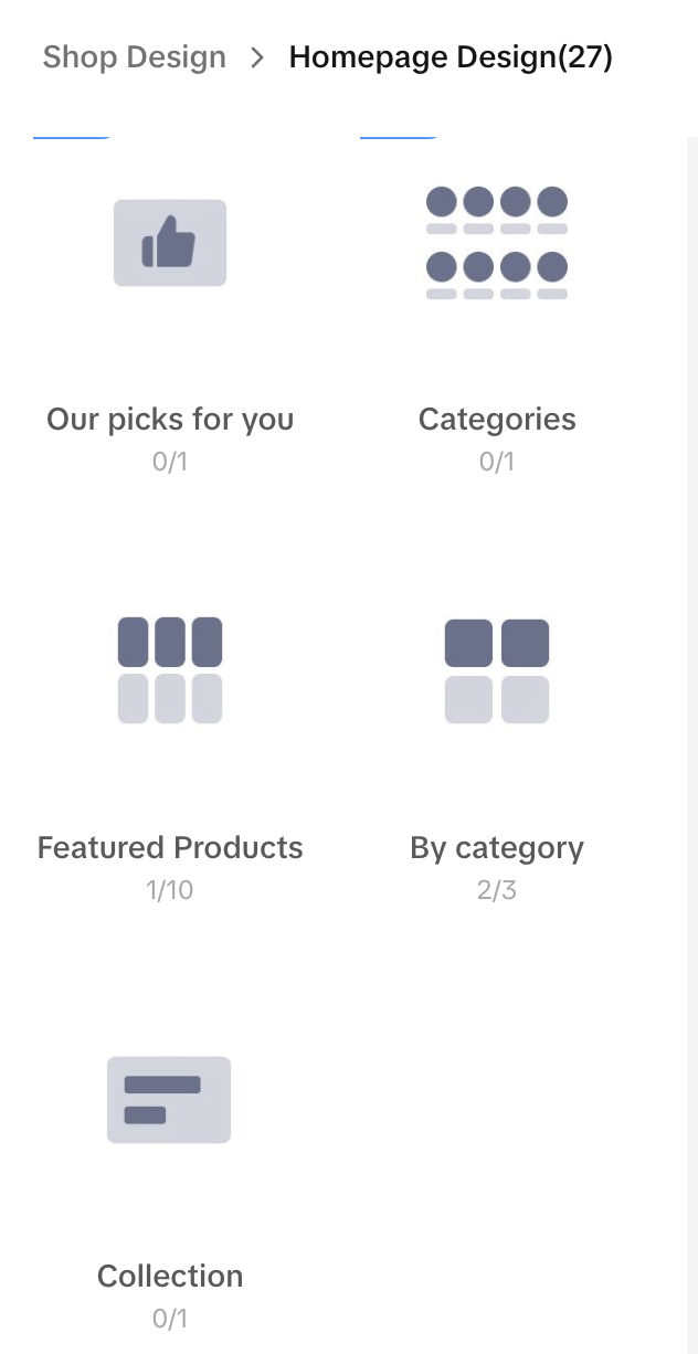 | 定制模块 要使用这些模块,卖家可以选择一个模块,并使用商店页面构建器右侧的Layout选项卡定义特定参数——例如照片上传、自定义模块名称、选择特定产品的链接等。 | Header image | 店铺背景图片 | ![]() ![]() ![]() ![]() | ![]() ![]() |