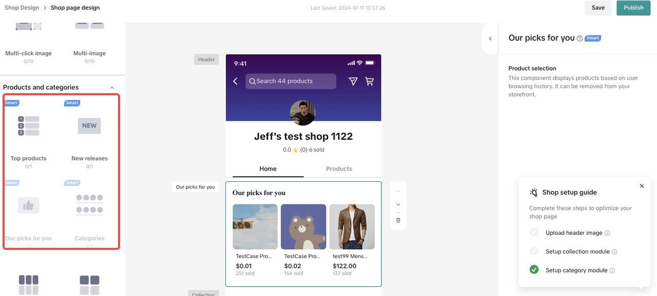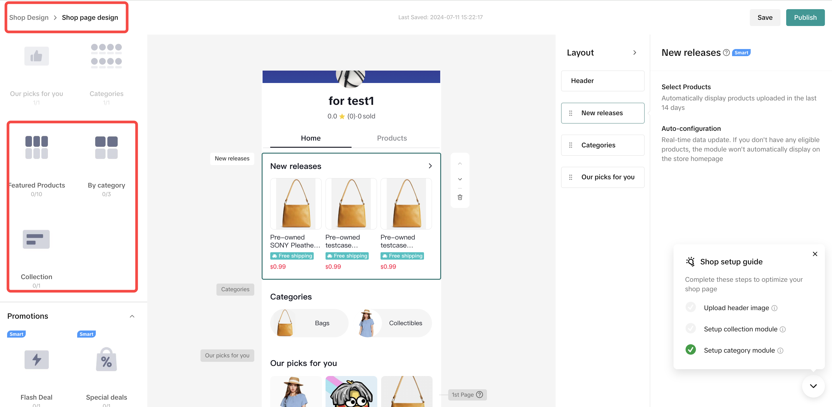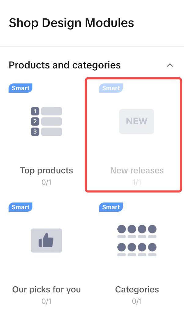 | 智能模块 这些模块是根据您的产品目录信息自动配置的。只需将组件拖放到店铺页面区域即可,无需进一步修改。 | New arrival/release | 店铺15天内发布的新品 | ![]() ![]() | ![]() ![]() |