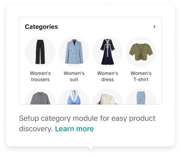 通过在店铺页面添加类别,帮助客户轻松浏览您的完整目录。类别是使用您的产品列表中的类别自动配置的。
