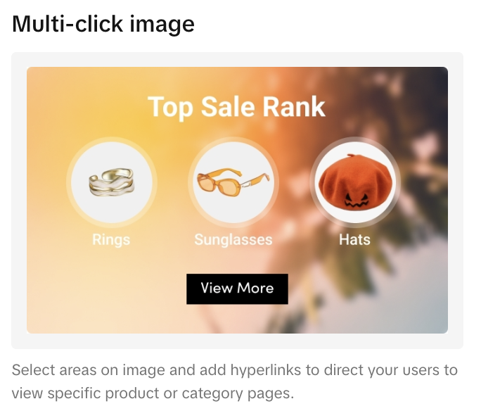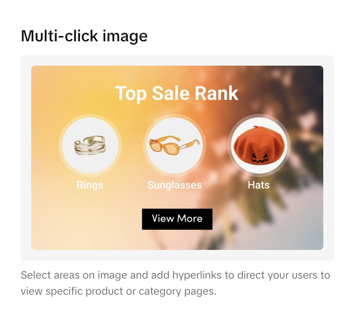 | | Multi-Click Image | 突出显示图像中可以链接到不同产品和/或类别的多个区域。 | ![]() ![]() | ![]() ![]() |