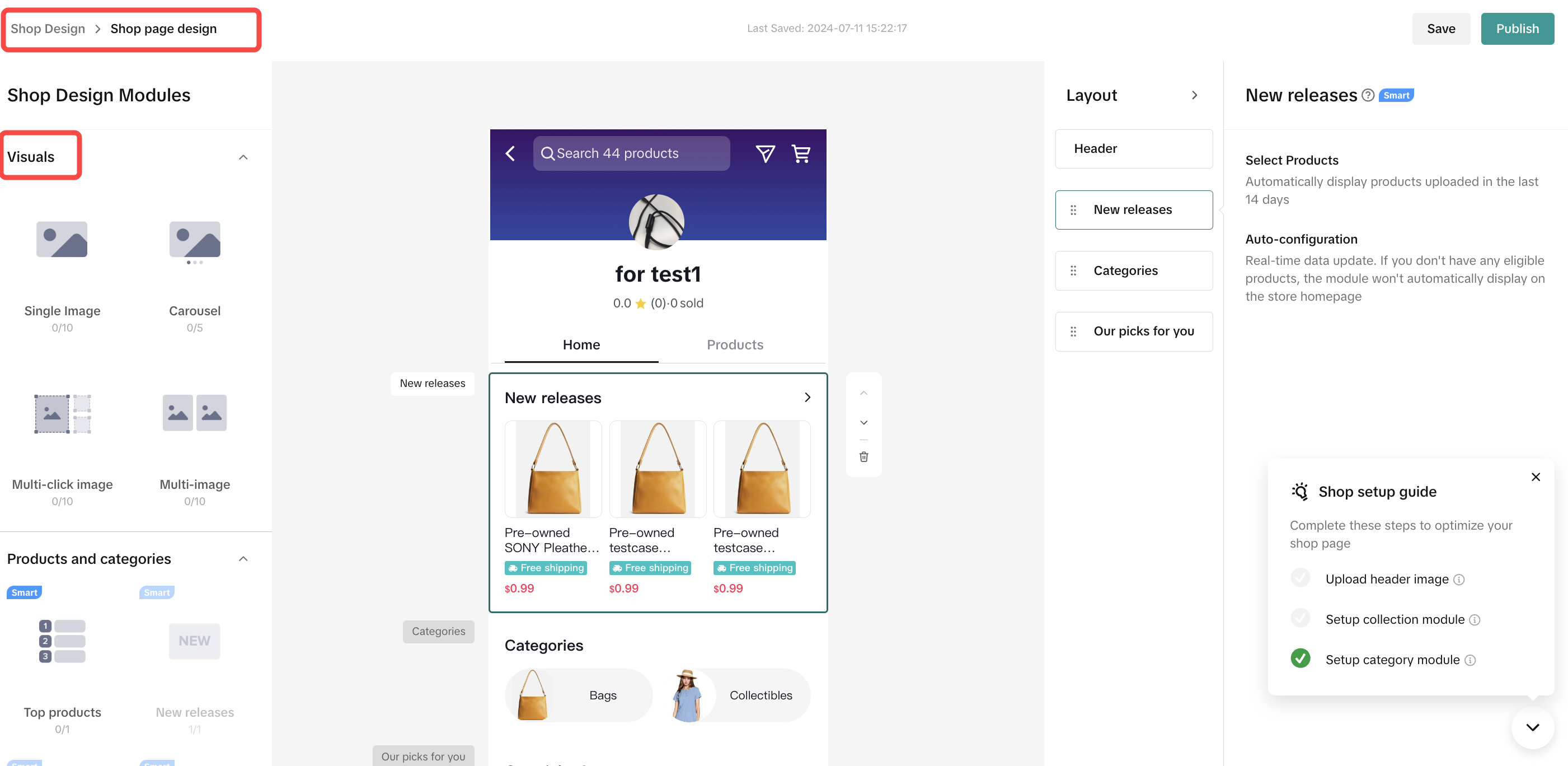 要使用这些模块,您可以选择一个模块,并使用商店页面构建器右侧的Layout选项卡定义特定参数——例如照片上传、自定义模块名称、选择指向特定产品的链接等。