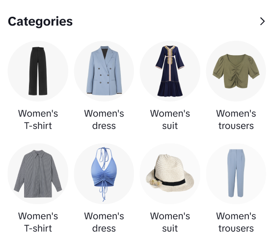 | | By Category | 选择类目,展示该类目下多个商品卡片 | ![]() ![]() | ![]() ![]() |