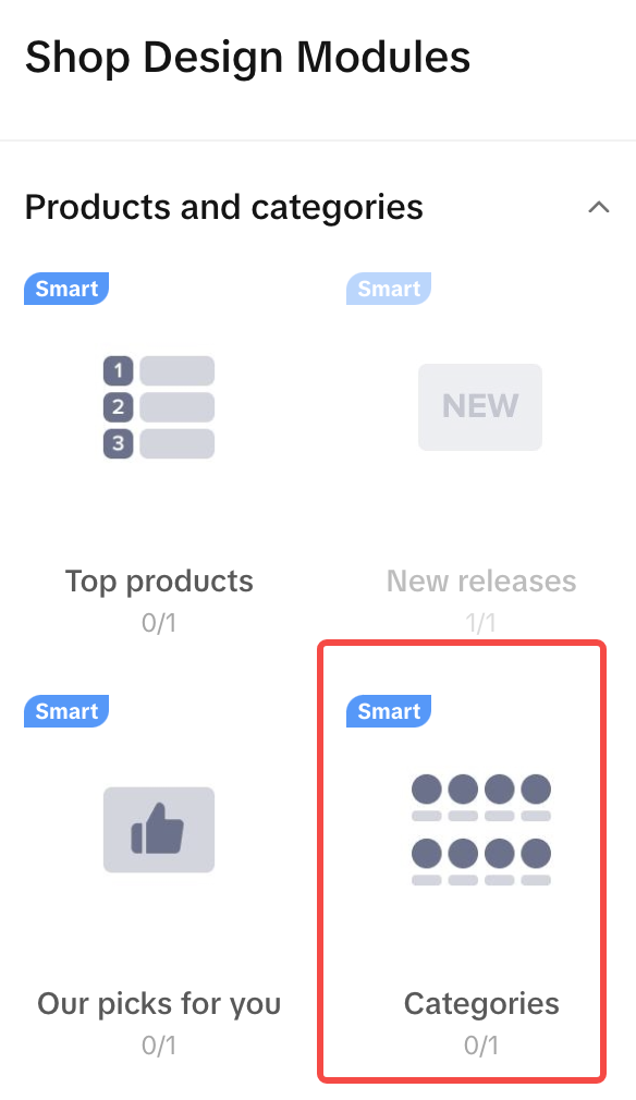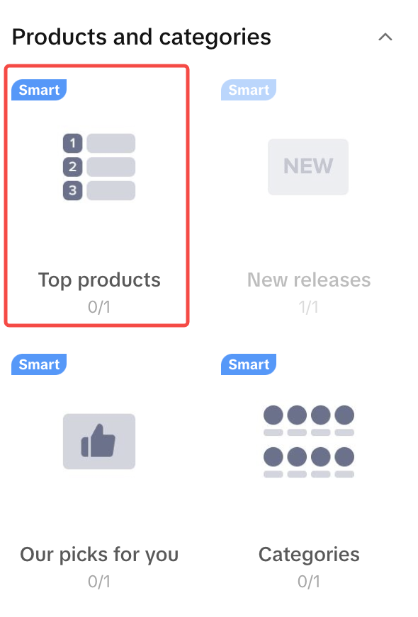 智能模块是根据您的产品目录信息自动配置的。一旦将智能模块拖放到沙盒区域,它将自动填充,无需进一步修改。请为您的商店主页使用至少2个或更多的智能模块。