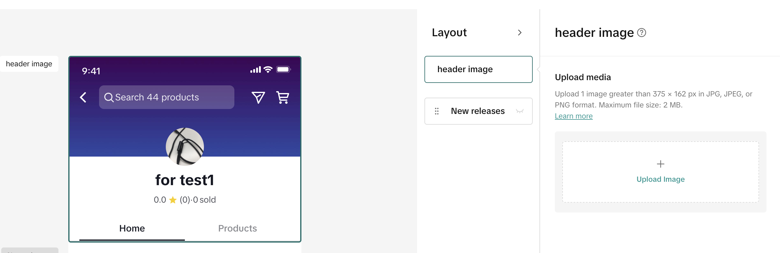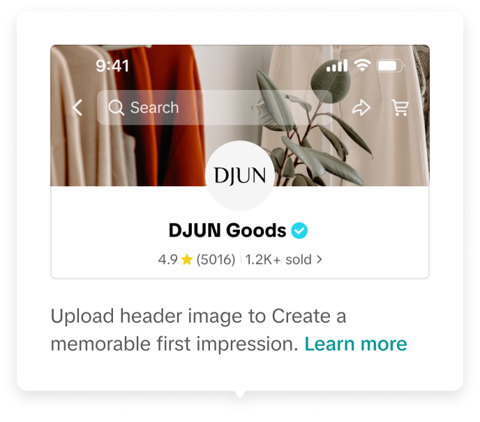 添加店铺头图以营造强烈的品牌印象,吸引用户查看。页眉图片必须为 JPG、JPEG 或 PNG 格式,尺寸大于 375 × 162 像素。(文件大小不超过 2 MB)