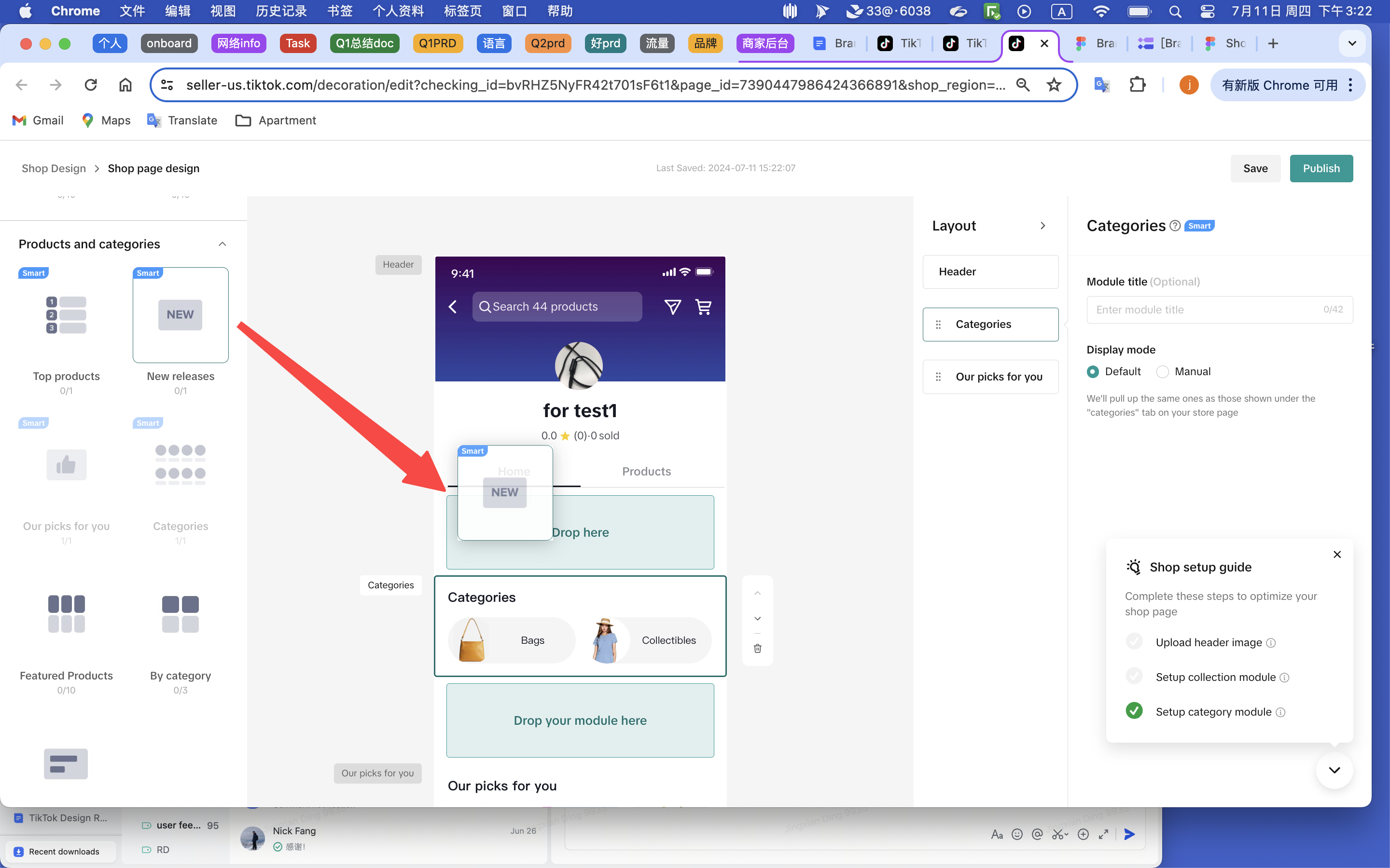 店铺页面设计采用简单的拖放界面。要添加模块,请点击模块并将其拖放到店铺页面构建器中间的灰色区域。这个沙盒环境允许您预览模块的外观。您还可以在沙盒中拖动模块以调整模块的顺序。