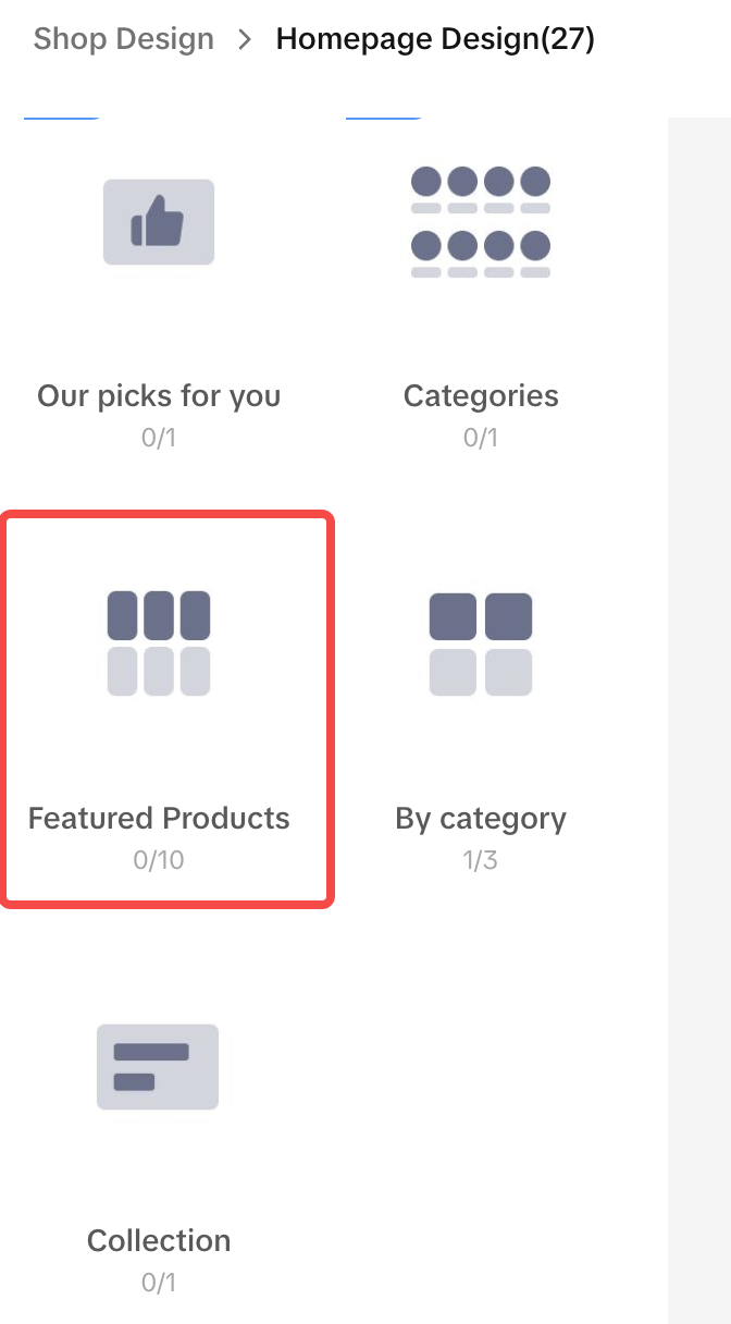 | | Product list/ Featured product | 卖家的固定产品推荐: 选择一批商品,在首页某个位置永久展示商品卡片,类似置顶商品 | ![]() ![]() | ![]() ![]() |