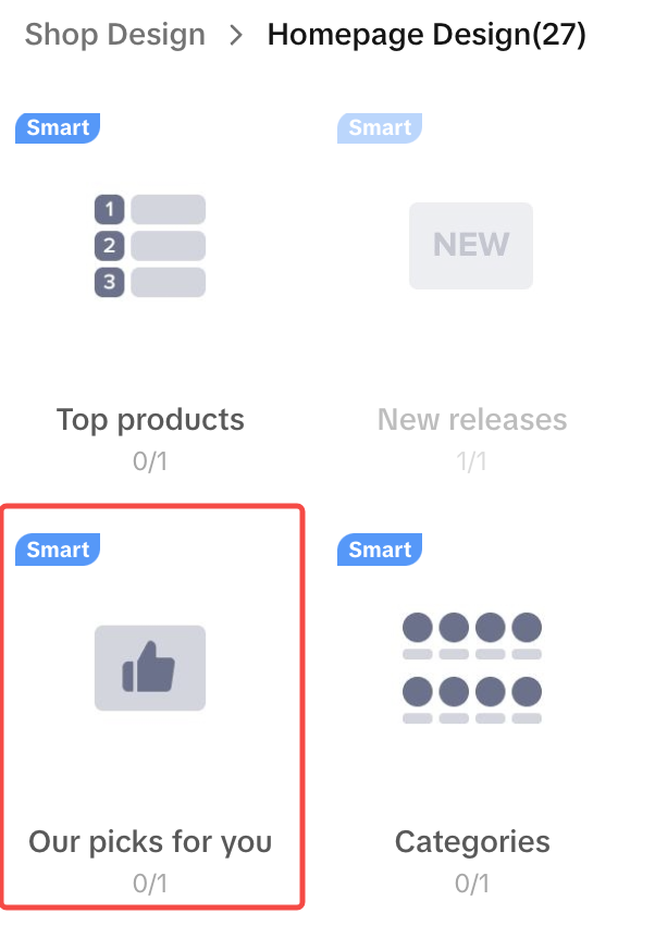 | 至少2个智能模块 | Categories, Top products, New releases, Our picks for you |