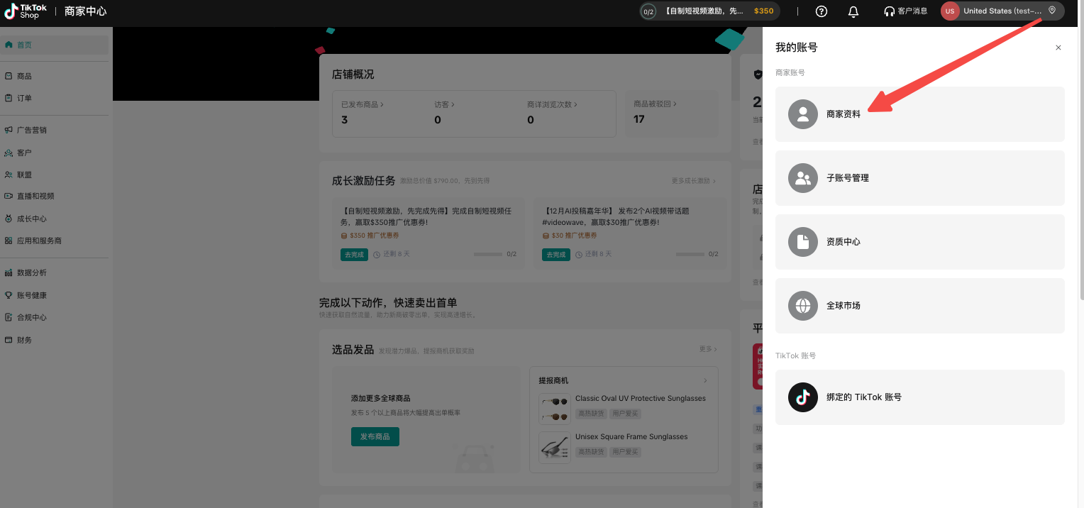 - 登录商家中心。点击页面右上角的店铺头像,进入我的账号 >商家资料信息页面。