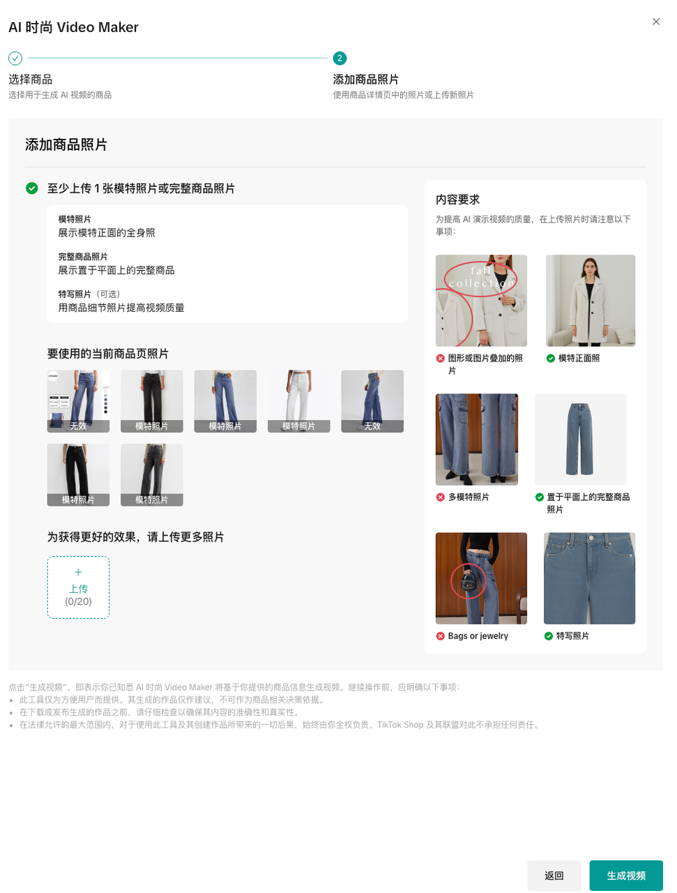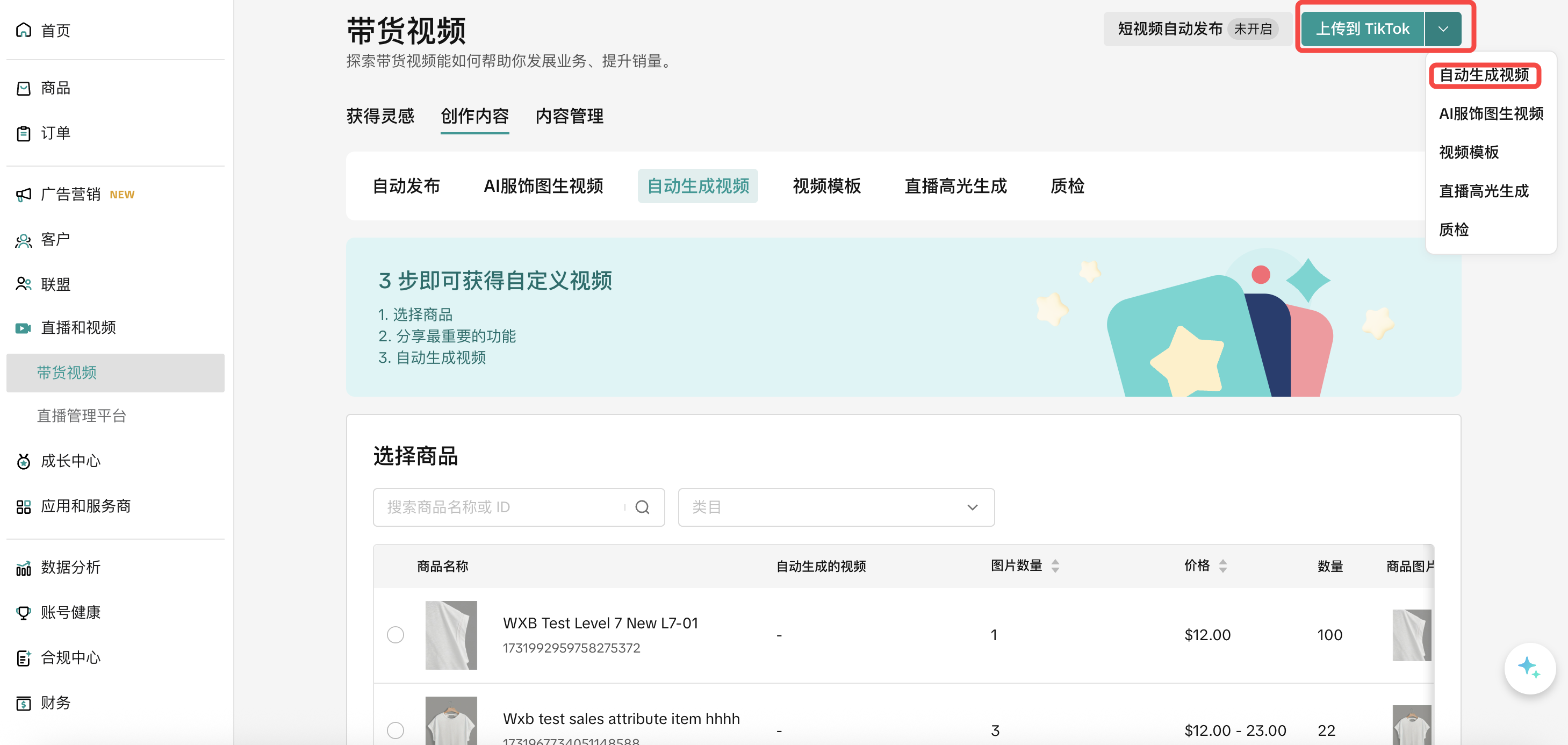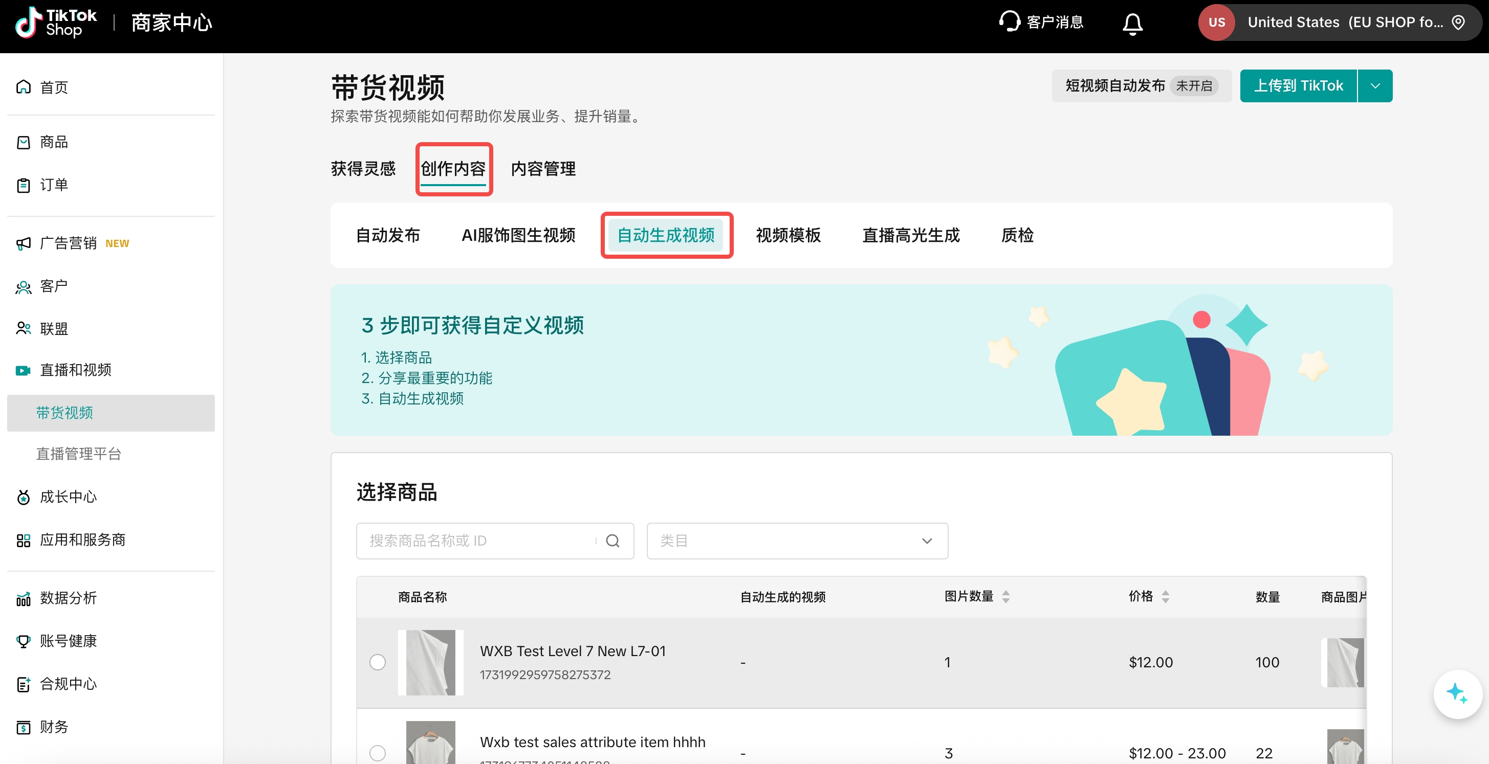 - 入口:https://seller.us.tiktokshopglobalselling.com/shoppable-videos/create-content/auto-generate?from=tab