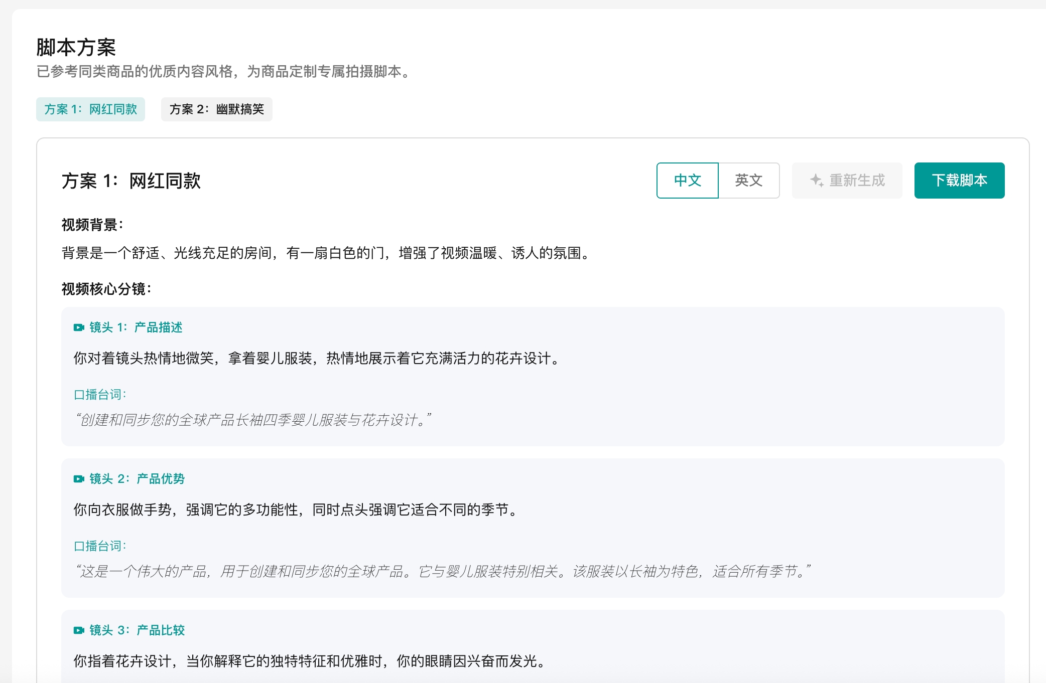 根据商品信息和卖点,按照最适合的风格,智能生成详细的分镜、布景和口播内容!