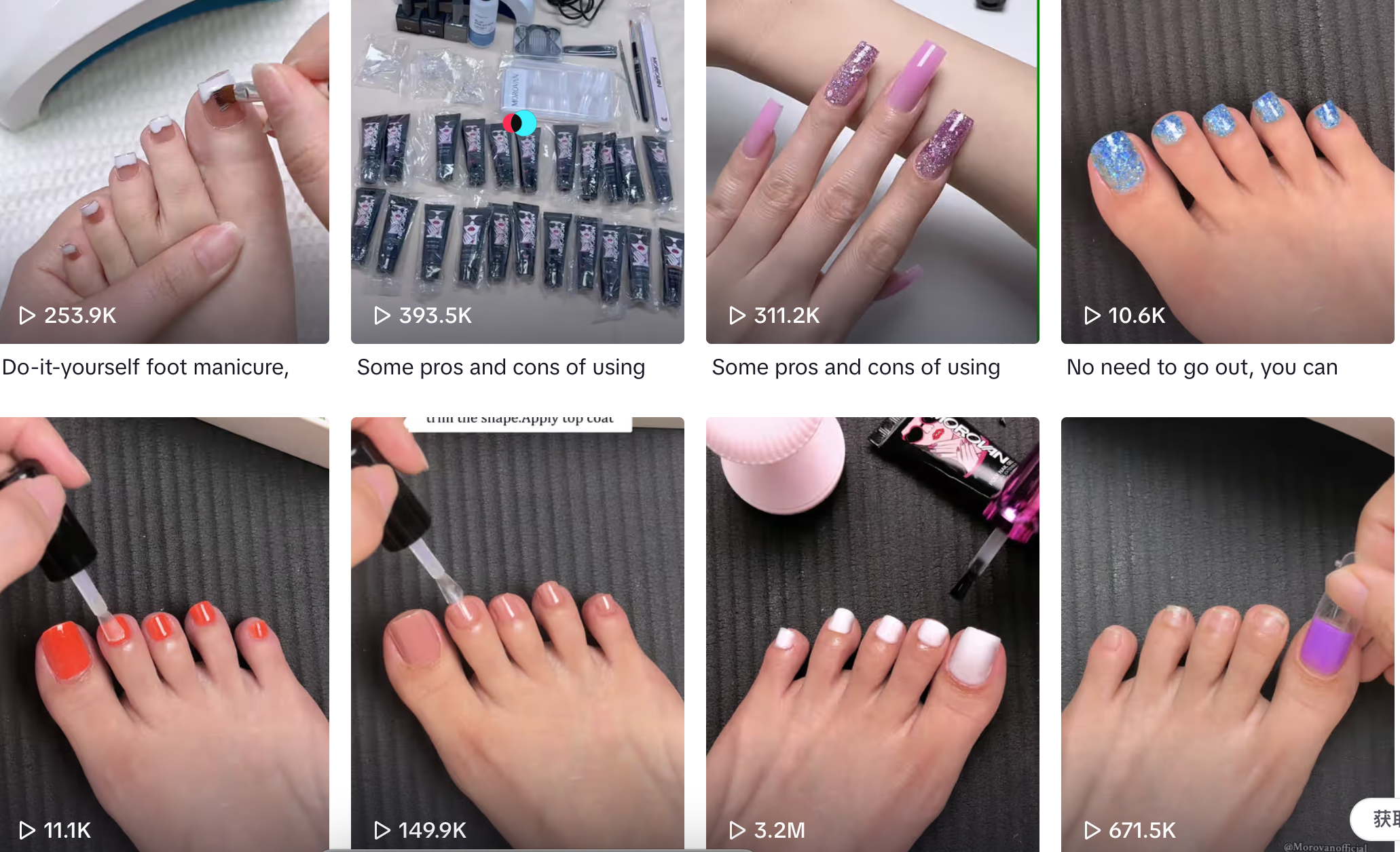 | 产品解说 | ⭐️⭐️⭐️ | 产品使用全过程展示 – 主打品、新品试用全过程 – 微产品使用教程 | 优势: 整体内容统一流畅,第一人称视角展示产品的外观、使用、成品效果,制作效率高成本低 劣势: 拍摄步骤多,相对繁琐,受众容易有疲劳感对商品丰富度要求较高 | MOROVAN Nails on TikTok![]() ![]() |