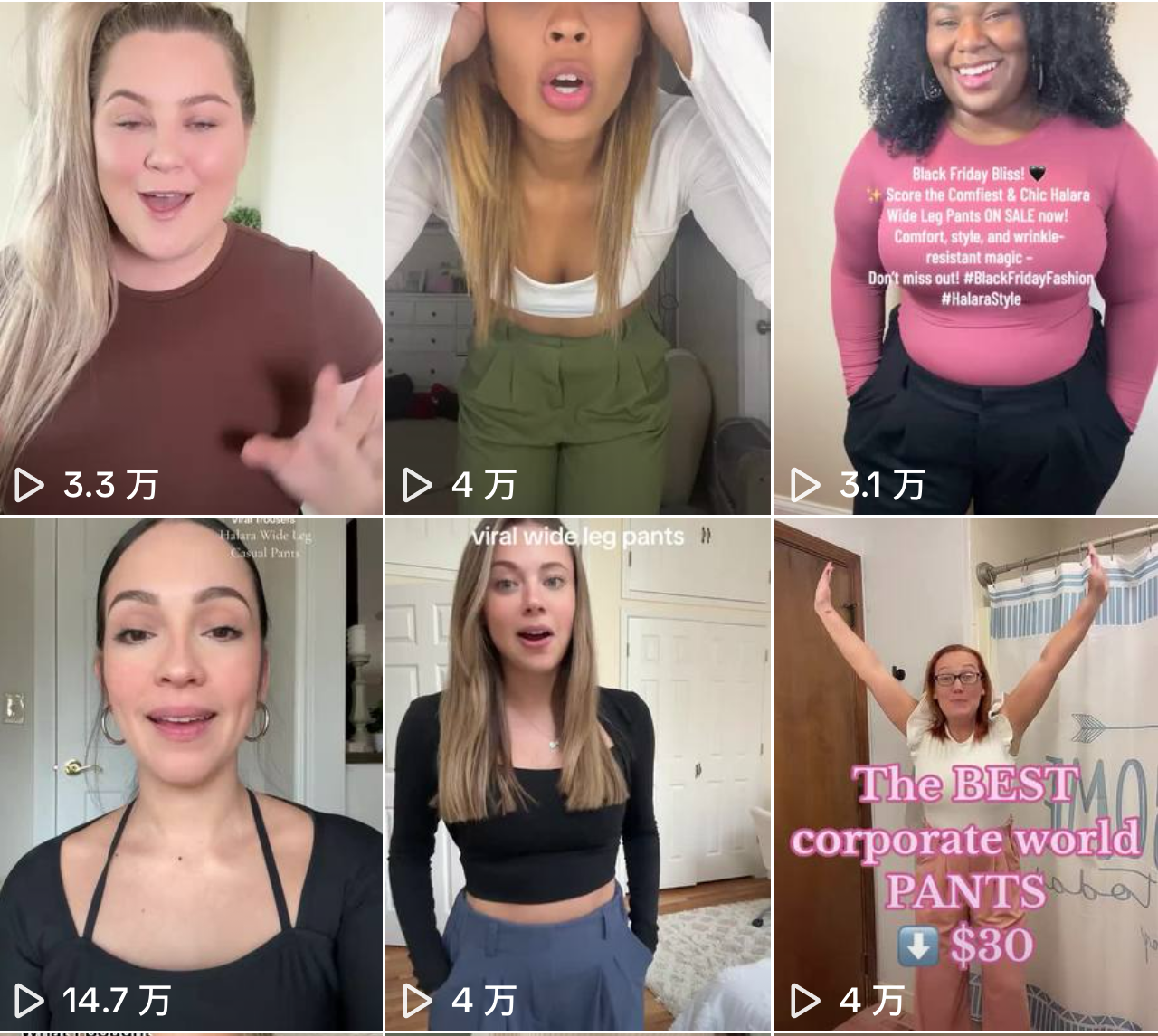 | 达人集锦 | ⭐️⭐️⭐️⭐️ | 合作达人的视频合集 – 不同的达人种草视频 | 优势: 内容丰富度和流量更好,在可看性更强,一定程度上的种草转化会比普通视频要好 劣势: 官方属性较弱,需要付出一定的成本,在沟通达人合作上需要单独给出未发布视频需求,防止重复发布导致搬运判罚限流 | Halara on TikTok![]() ![]() |