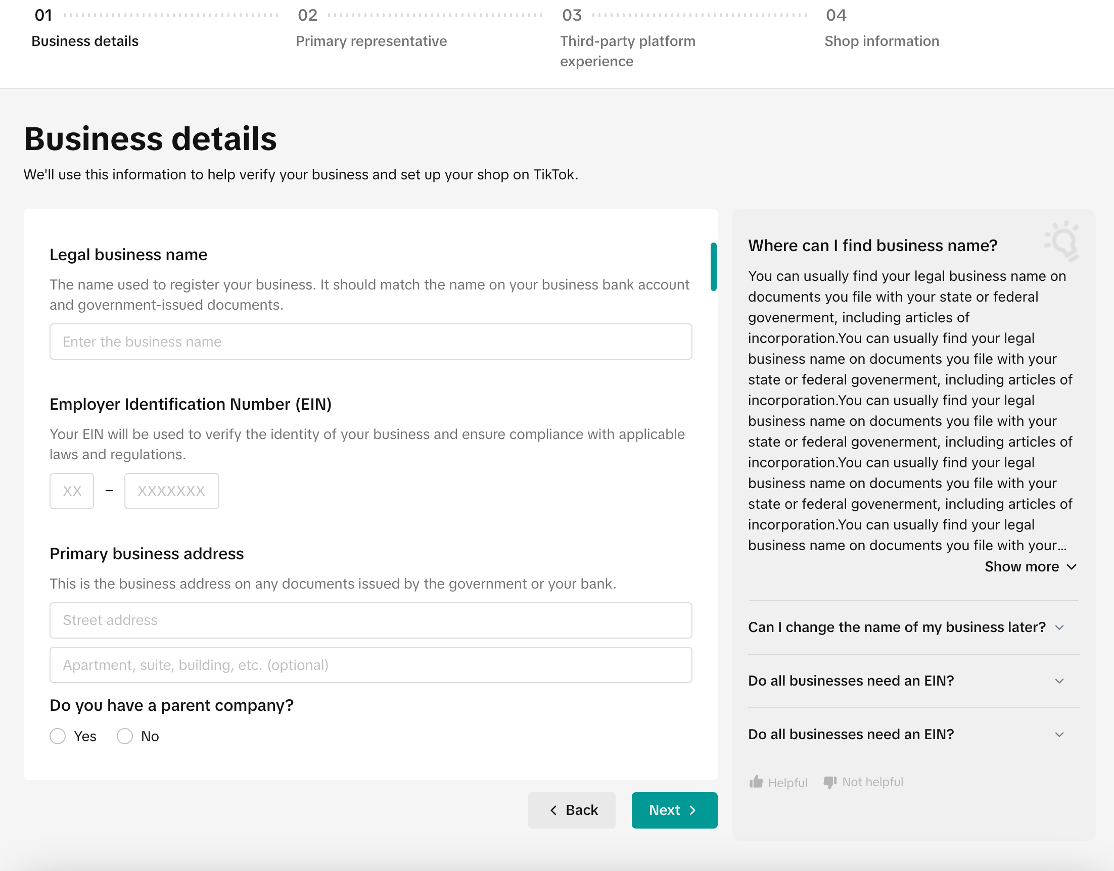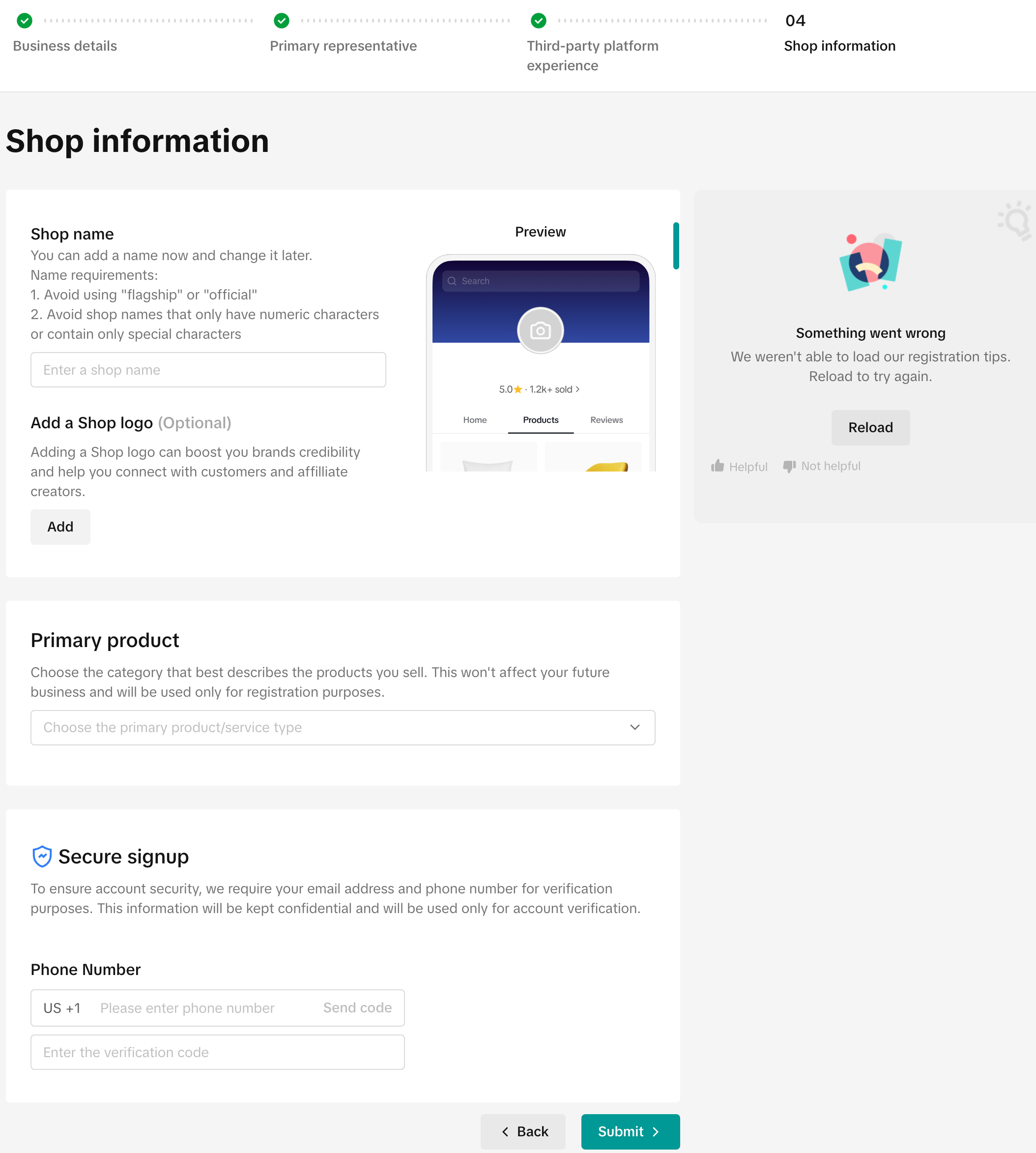 ![]() ![]() | 1. 店铺名字要求: – 所有店铺名称必须准确代表申请人的业务。 – 所有店铺名称不能超过40个字符。 – 所有店铺名称不得包含非法信息,例如:禁售商品名称或歧视性语言。 – 店铺名称不得包含任何不恰当的政治语言或其他可能引发误解、偏见、争议或对消费者产生负面影响的信息。 – 所有店铺名称不得包含任何攻击或煽动针对个人或群体的仇恨言论或内容。 – 我们不允许店铺名称中包含性暗示或露骨的内容。 – 我们不允许店铺名称中包含任何侮辱性的内容,包括但不限于暴力威胁、性骚扰或针对外表、智力、个性特征、卫生的诋毁性言论。 – 未经TikTok Shop事先书面许可,我们不允许任何店铺名称提及“TikTok”。同样,未经授权许可,我们不允许店铺名称出现与第三方平台相关的术语(例如:Lazada、Shopee、Amazon、Instagram、Facebook等)。 – 未经相关品牌所有者的书面许可,店铺名称不得包含任何品牌名称。此外,所有店铺名称都不得引起任何第三方品牌的误解。如果申请人在其店铺名称中使用“官方”、“旗舰”、“授权”、“品牌”或类似字眼,那么申请人必须提交品牌所有者的必要授权。请注意:此要求同样适用于所有TikTok用户资料。 – 我们不允许店铺名称中包含任何比较性或夸大性描述的字眼,例如:“更好”、“最好”、“对比”等。 – 我们不允许申请人复制TikTok Shop其他卖家的店铺名称。 – 所有店铺名称不得包含任何外部联系方式或网站,例如:电话号码、社交媒体账号信息、“http”链接、“.com”域名等。 – 所有店铺名称必须使用TikTok支持的当地市场官方语言。 – 所有店铺名称不得包含文本字符串、不得仅包含字母数字、不得包含特殊字符(例如:*、\、?、])。也不允许纯数字的店铺名称。 – 所有店铺名称不得包含无法清晰代表经营实体的纯通用词汇或纯类目名称,例如:“汽车”、“店铺”、“商店”等。 2. 最后一个电话需要是美国本地电话号码,且从未在TikTok Shop注册使用过 |