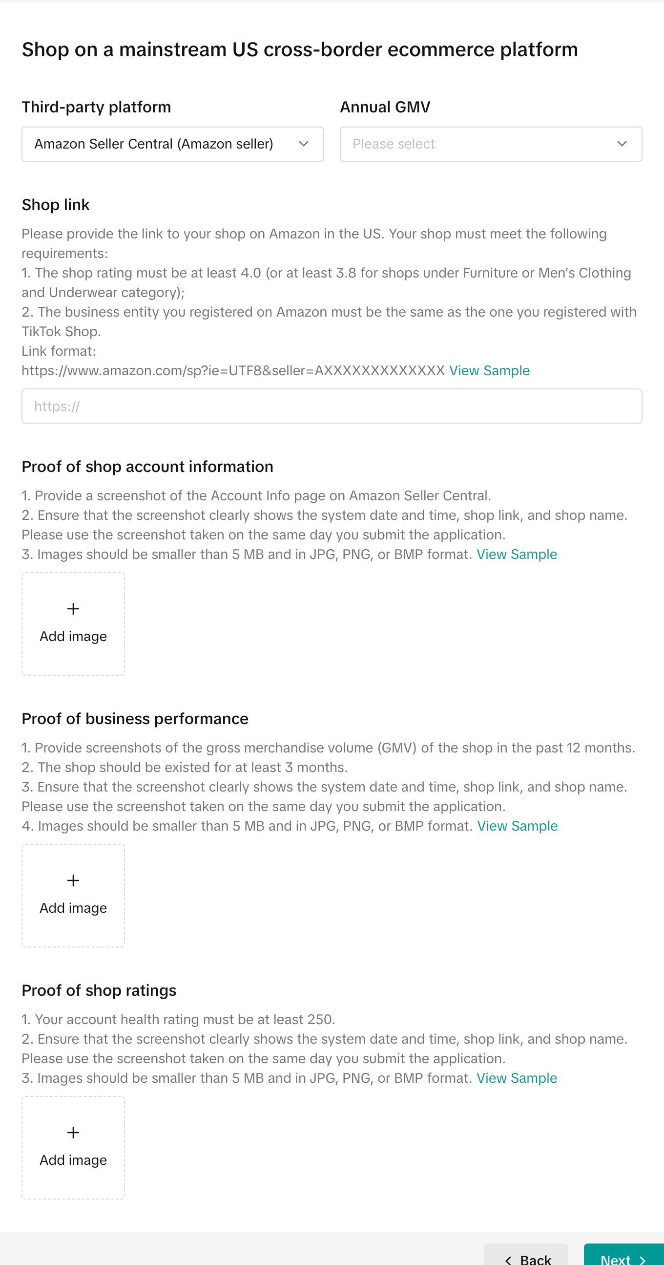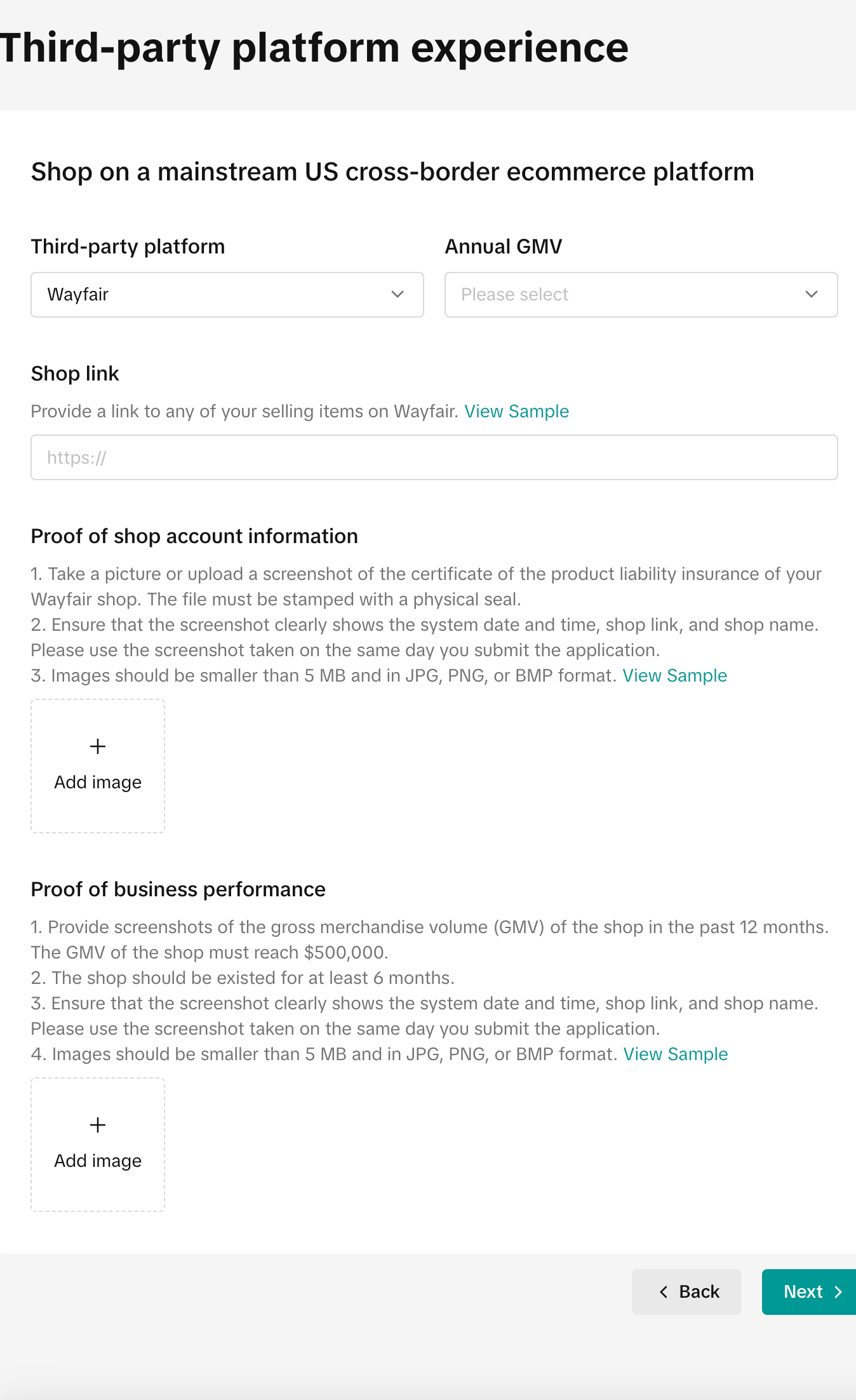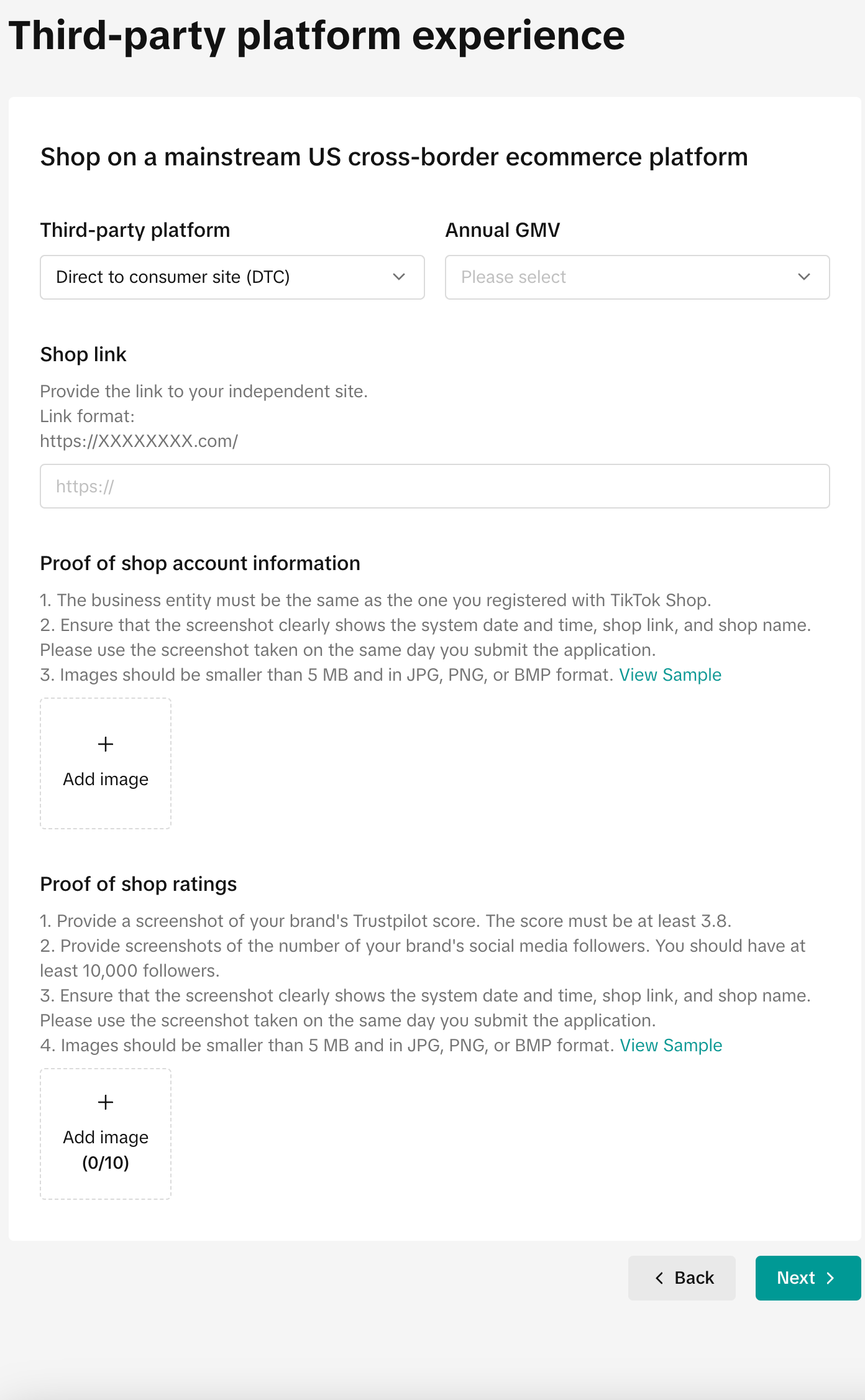 | Do you have experience of running business on mainstream cross-border ecommerce platforms in the US? ◯ No ◯ Yes ![]() ![]() | – 不同的三方平台具体的要求资质不一样,请根据自身情况选择并且提供对应的三方资质![]() ![]() ![]() ![]() ![]() ![]() ![]() ![]() ![]() ![]() |