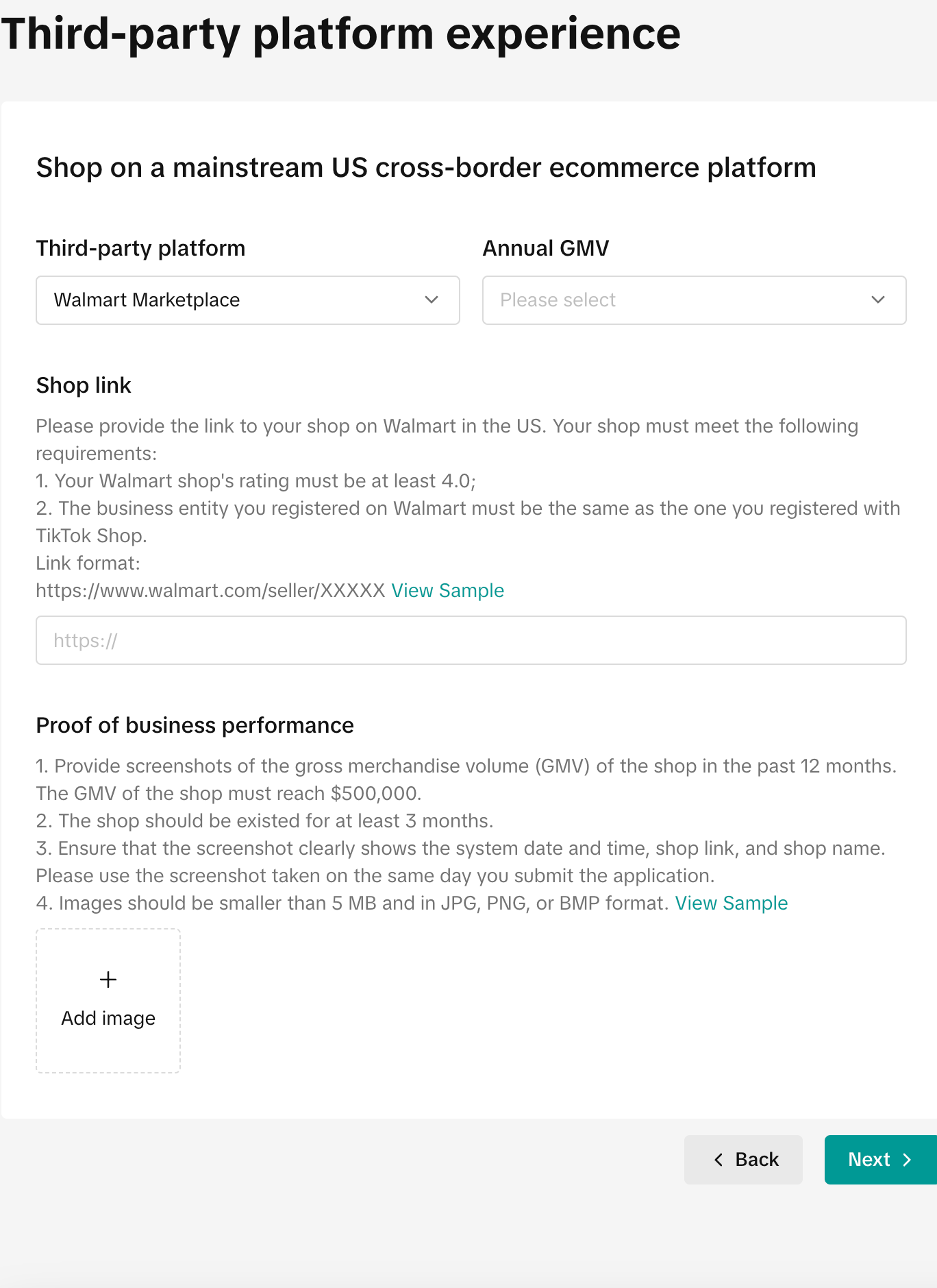 | 1. 选择三方平台和GMV | 2. 补充三方平台运营经验证明 |