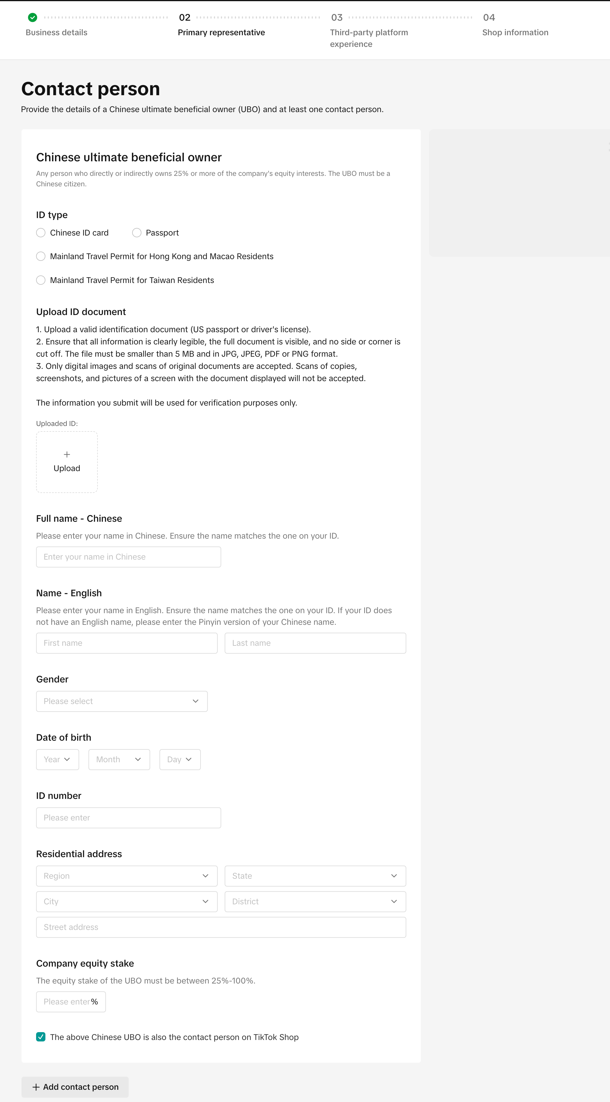 ![]() ![]() | ![]() ![]() 美国资质企业注册TikTok Shop跨境业务,最终受益人(UBO)必须是中国人;UBO的股权必须在25%-100%之间。 支持上传证件:中国内地身份证/中国港澳台居民来往内地通行证/中国公民护照 Residential address::填写中国UBO目前实际居住地址 |