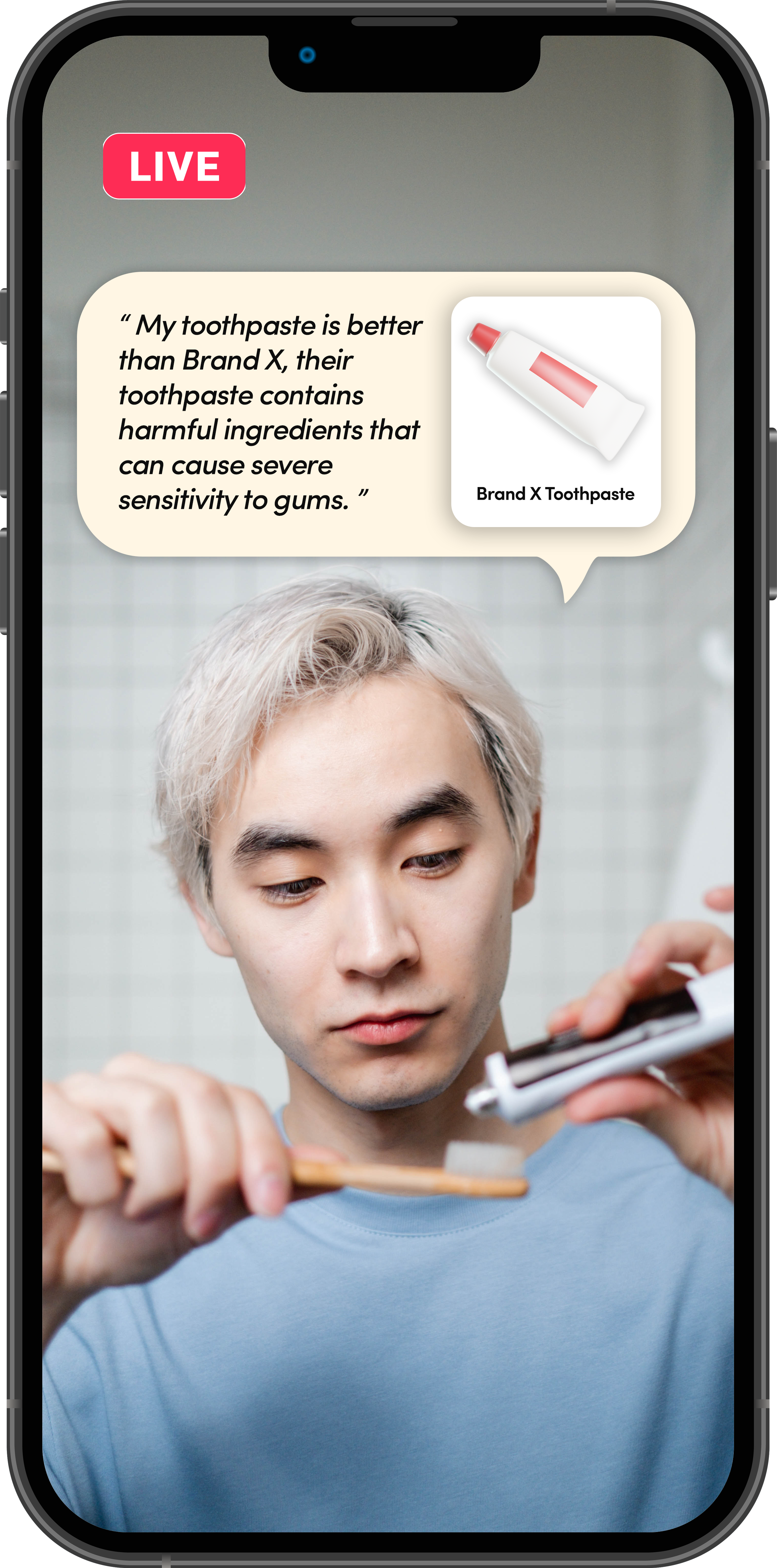 在本示例中,达人声称其牙膏优于竞争品牌,因为竞争对手使用了可能对牙龈造成严重敏感的有害成分。