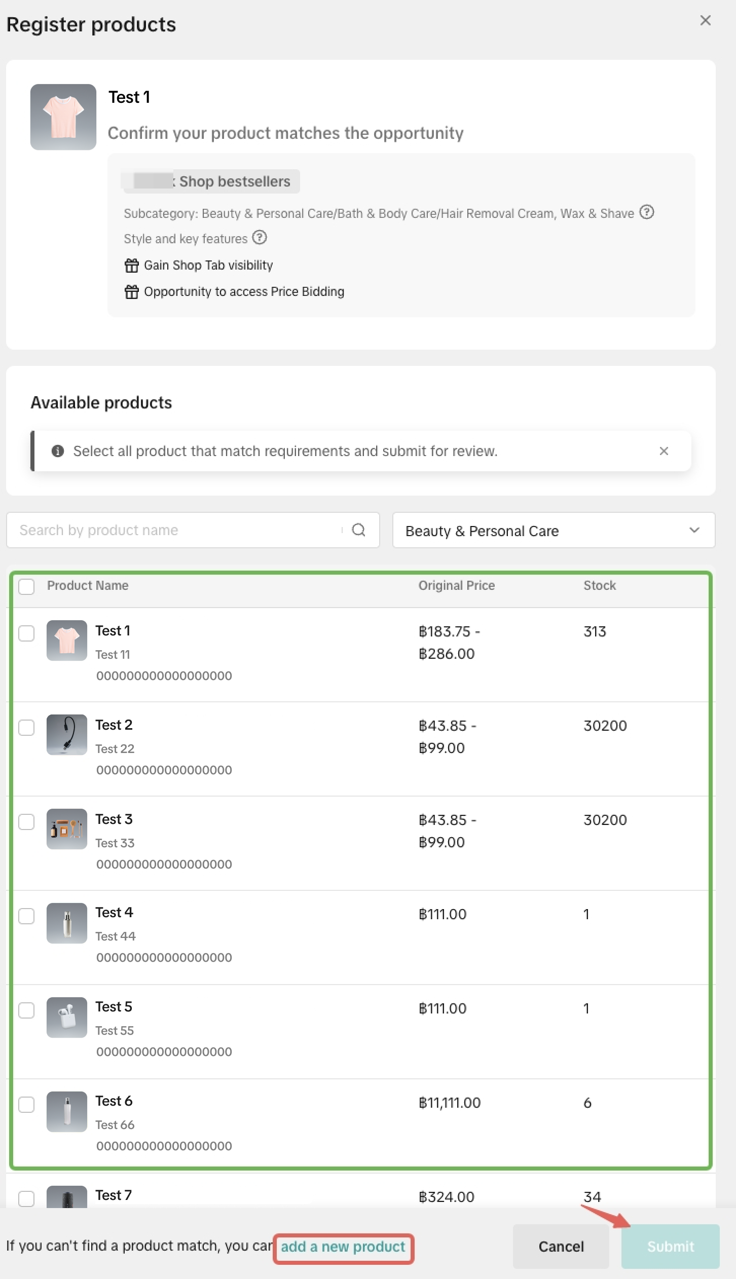 - 在添加商品机会详情页右下角可以【选择商品】/【新增商品】。快速上传5个商品并通过审核,轻松领取奖励!