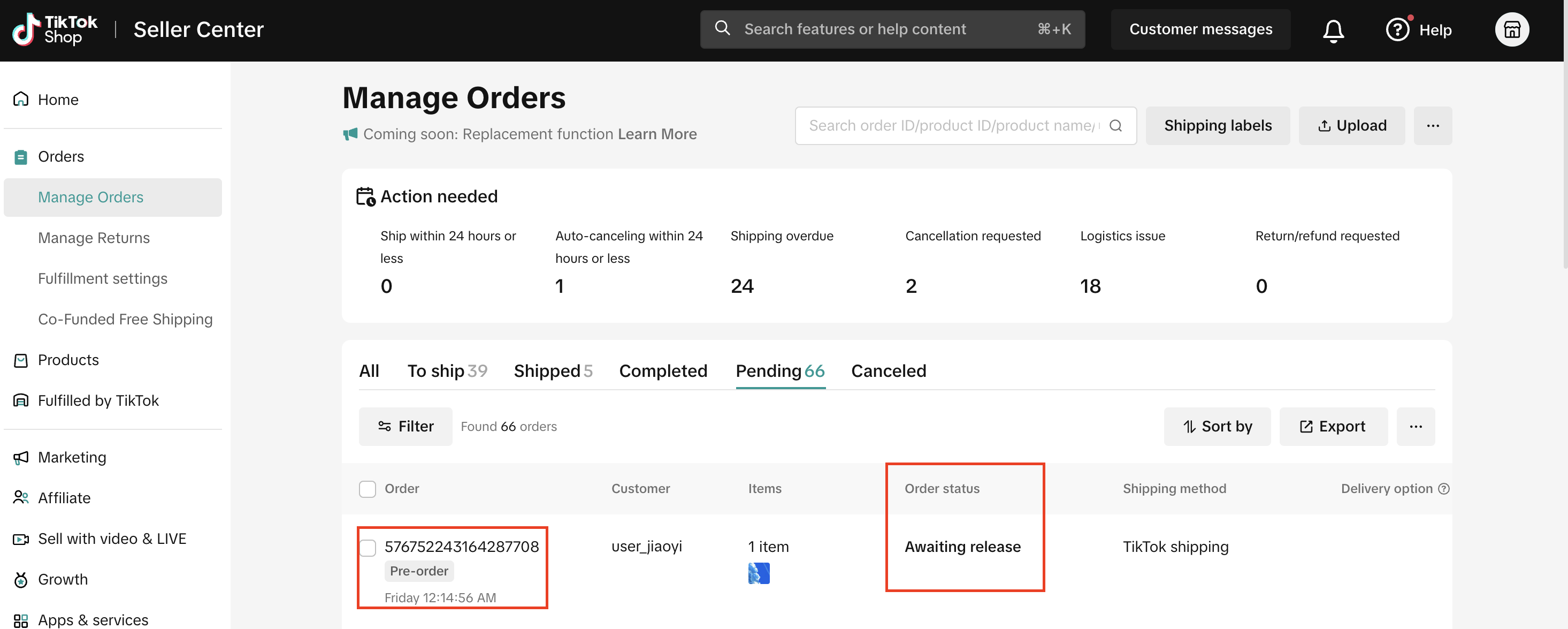 点击左侧导航栏的“订单”,选择“管理订单”,查看所有订单状态。可在“待处理”标签页下查看预售商品订单,在商品SKU设定的发售日期前,预售订单状态将显示为“待发售”。发售日期过后,该状态将按照常规订单变更为“待发货”,并转移至“待发货”标签页下。