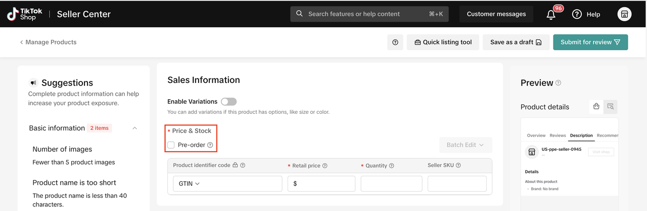 填写基础信息与商品详情,然后在“销售信息”栏勾选“预售”选项。