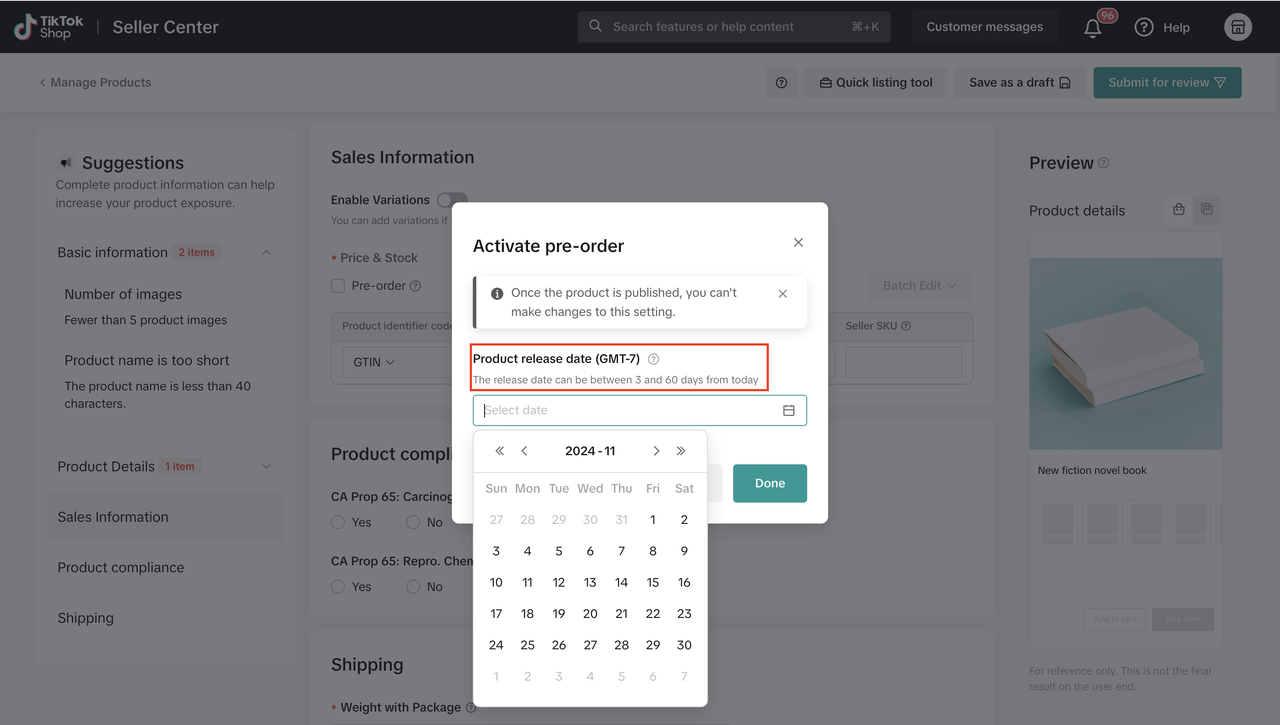 发售日期即可购买商品的起始日期,以您个人资料设置中指定的时区(见步骤1)的凌晨12:00为准。商家可将商品发售日期设置为从当天起3至60天内的任意一天。